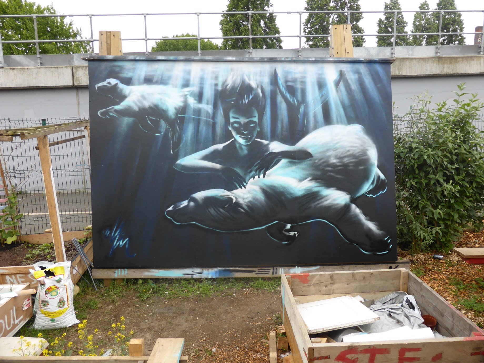 This evening in our series of more-in-depth look at some of our favourite works from the fantastic Meeting Of Styles event in London last week, we are going to take a look at a piece by an artist we were previously unaware of but very much glad we got to discover, namely Elfin. Hitting up one of the events highlights, this piece is just so soulful, exuding a sense of peace and serneity, depicting a mermaid swimming with a pair of polar bears and beautifully tied together with the sun beams shining down through the water, this work really stops you in your tracks.
