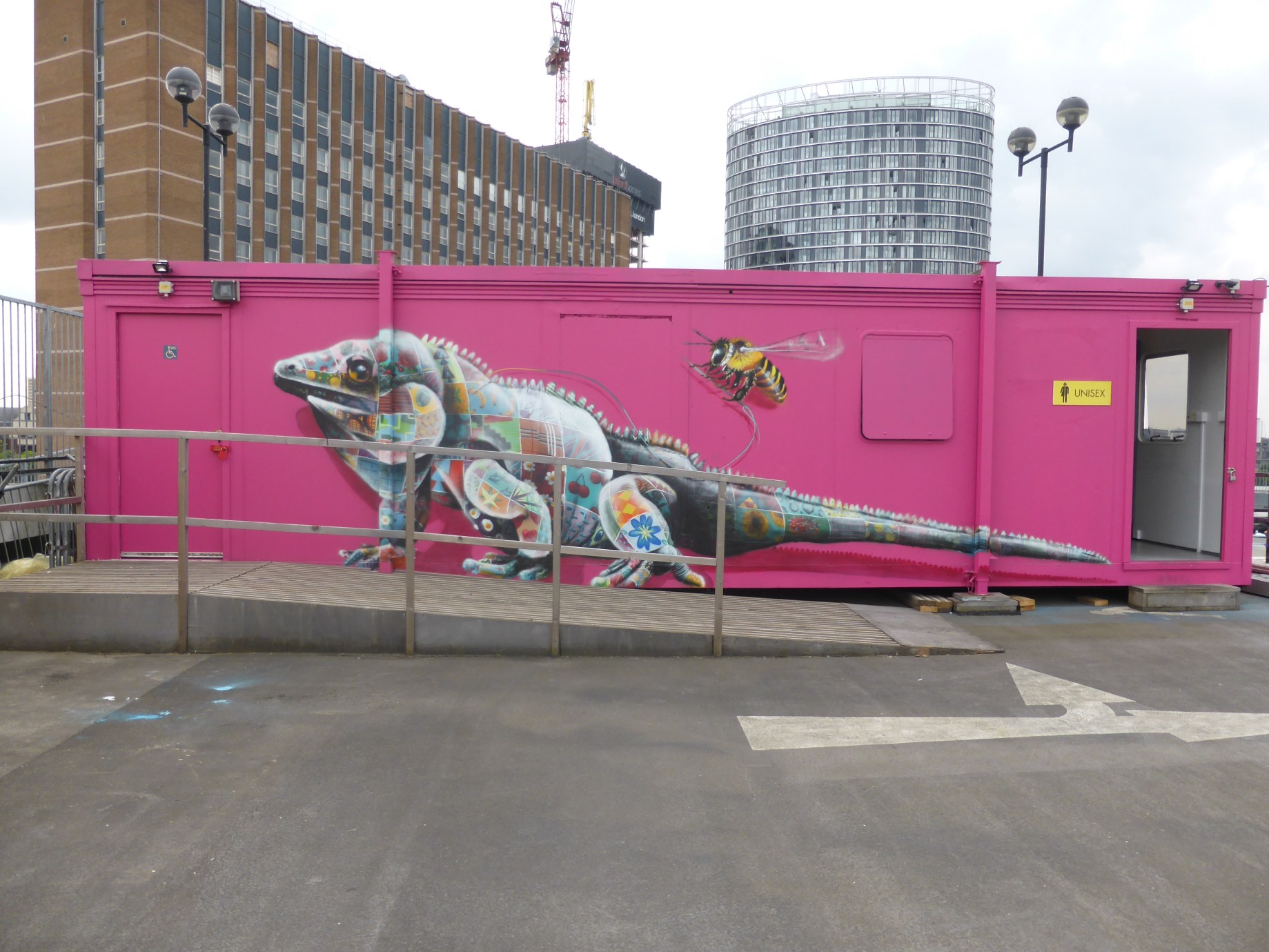 Last weekend saw Environmental activist Street Artist Louis Masai take to the rooftop of Roof East Cinema in Stratford to lay out his latest works, with two pieces, one featuring a Save The Bees Mural and the other featuring one of Masai’s patchwork creations, on this occasion of a Blue Iguana. Louis Masai has certainly been active of late around London, with taking part in Paint Your London in Walthamstow (covered here), organizing and participating in Endangered 13 (covered here), painting in Sydenham Woods as part of the Dulwich Festival (covered here) and collaborating with Fanakapan for Meeting of Styles (covered here), never one to disappoint, these two new rooftop murals are no exception.