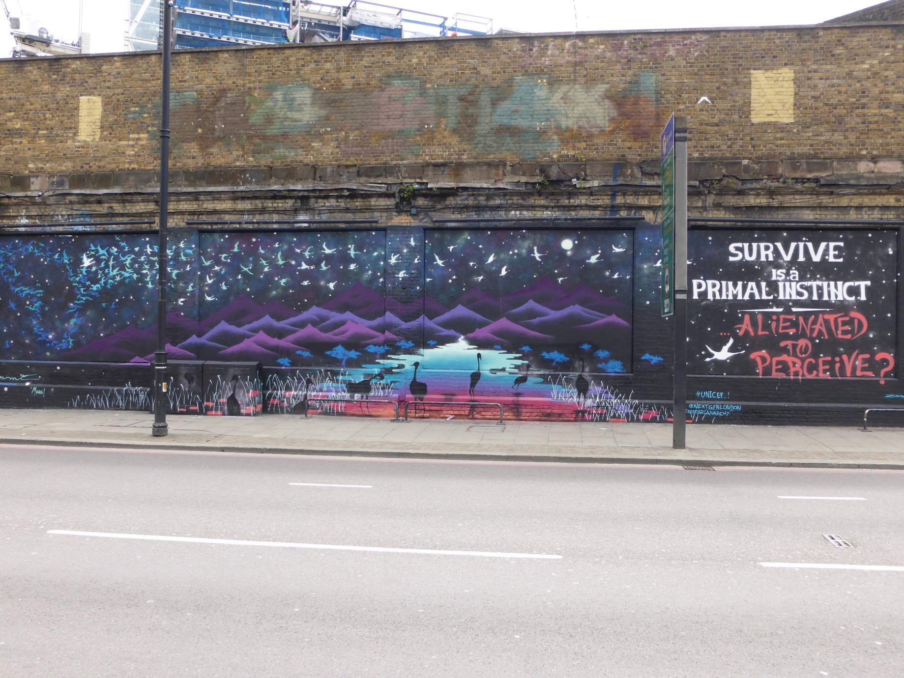 Last week saw Argentinian born, but Brazilian based, Street Artist Marina Zumi make her second visit to London for 2016, with her first visit in February (covered here), in order to paint a beautiful and striking piece for the charity Unicef. Painting for Unicef the world’s leading organisation for children in over 190 countries, this work was put up as part of their current campaign to raise funds in support for kids in Syria. The stunning and soulful piece painted by Marina Zumi features 300 Eurasian Cranes set amid a mountain scene, with the majority of the cranes set travelling on their journey, whilst a few are left behind without their fellow family members in the waters at the forefront of her scene.