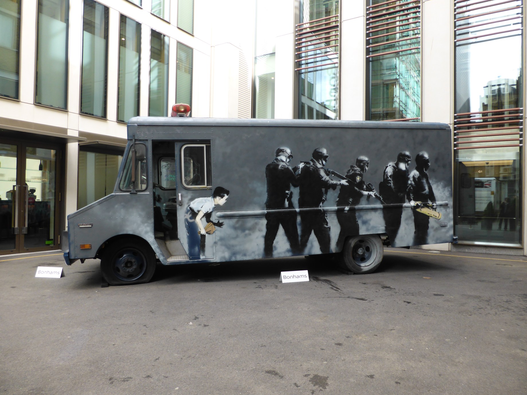 This has been the first time this piece has been on display since its initial showing a decade ago. Certainly something we couldn’t miss going to take a view of upon hearing of the showing just before it was sold. The work presents a most interesting canvas, namely the genuine retired SWAT Van from the LA Police force, and in turn a well chosen subject matter comprising his distinctive stencil works focused on dark humour and satirical representations of social themes. In this case the work features on the one side Banksy has placed a group of heavily armed special forces agents about to be tricked by the mischievous little boy set to pop his inflated paper bag, in turn sending the agents into action. On the other side of the van is an unsuspecting Dorothy, from the Wizard of OZ, swamped by a sea of tags, presenting quite the contrast to the other main image.