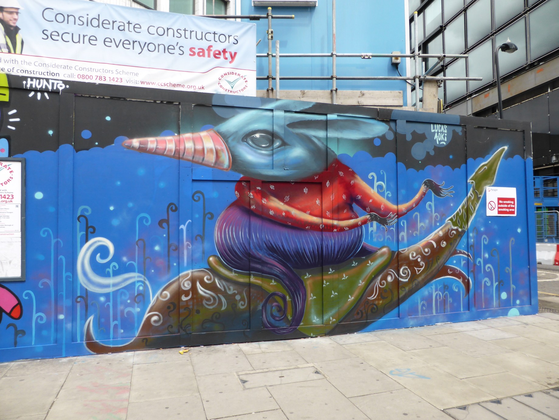 Last week saw Argentinian, but Texas based, Street Artist Lucas Aoki hit London and leave us with a single beautiful work to enjoy in Shoreditch. Lucas Aoki’s art is inspired by friends, family, travel and the outdoors with this particular piece offering a rather surreal character drawing on features from land mammals and sea creatures presented in striking soft tones creating a real sense of calm and warmth. This work can be found on Great Eastern Street, Shoreditch.