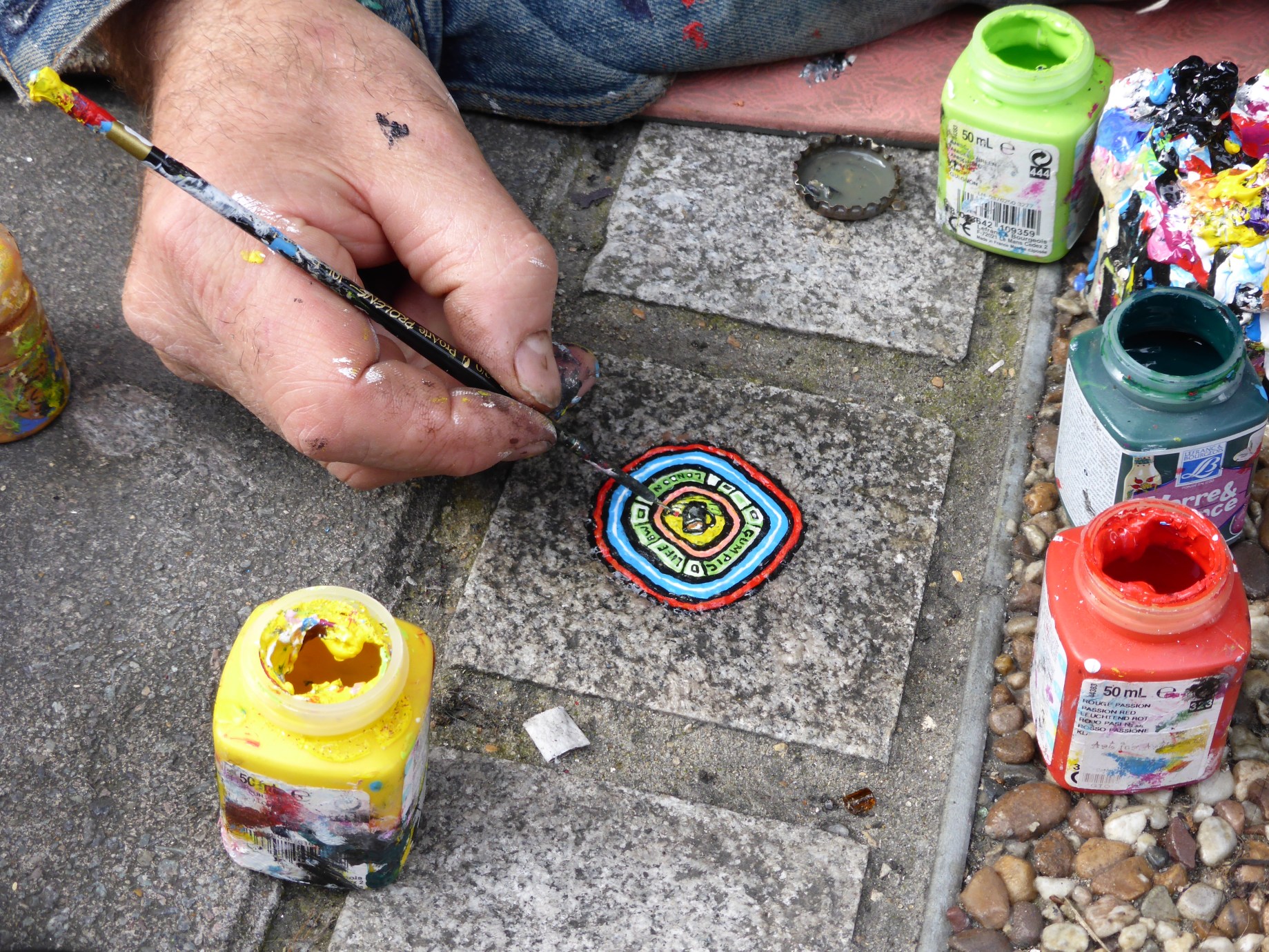 Work in Rivington Street featuring the cup of tea that someone kindly brought to him.