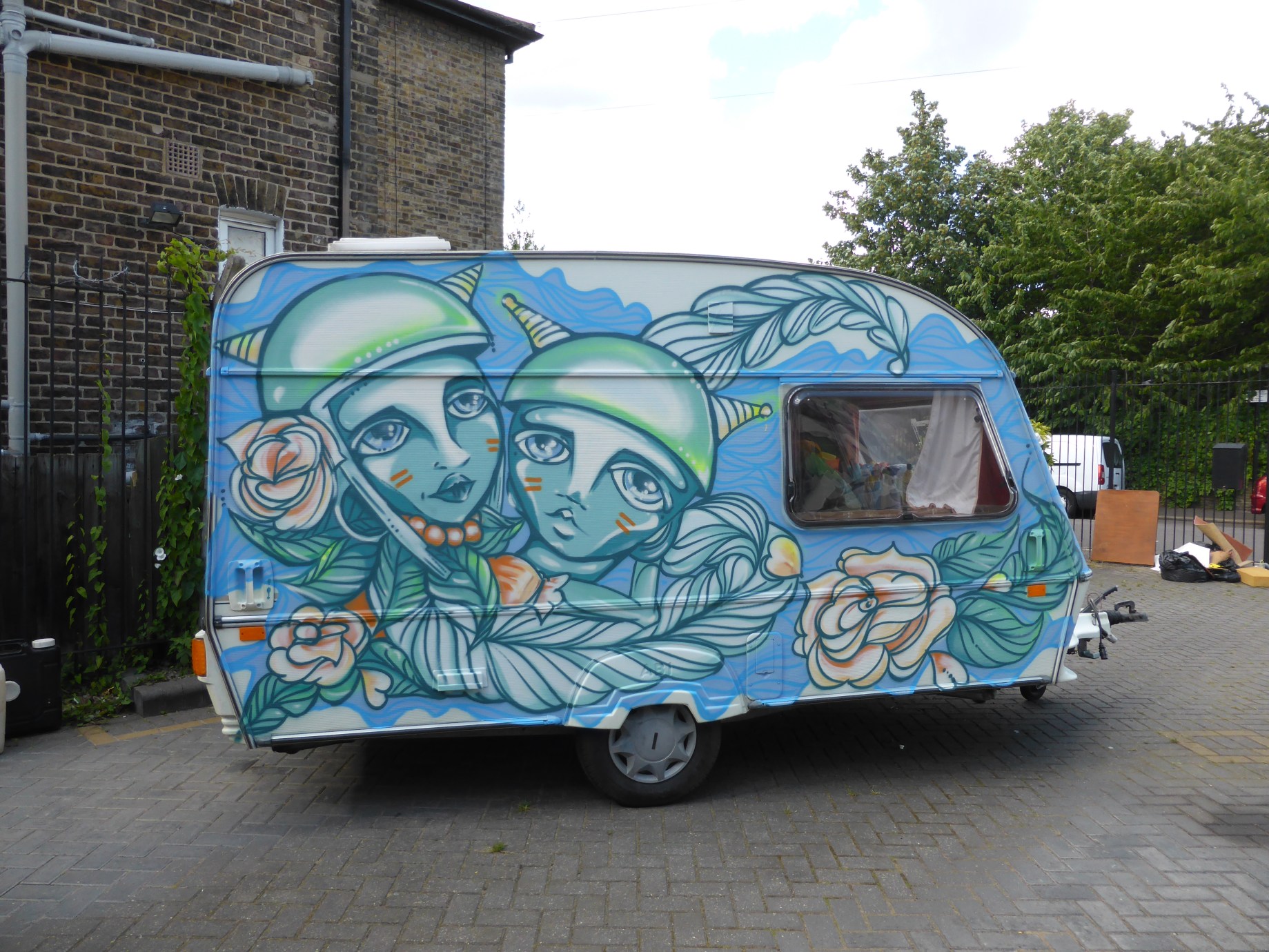 Playing catch up again this morning we are taking a look at a pair of delightful works created for a great cause by Street Artists Elno and Frankie Strand in Walthamstow as part of a beautiful project we wanted to share here with you. Put together by Wood Street Walls working on behalf of Walthamstow and the Caravans to Calais project to support migrants in the Jungle. In conjunction with this, local MP Stella Creasy led a fundraising effort to buy and fill three caravans for supporting families currently in the Jungle.