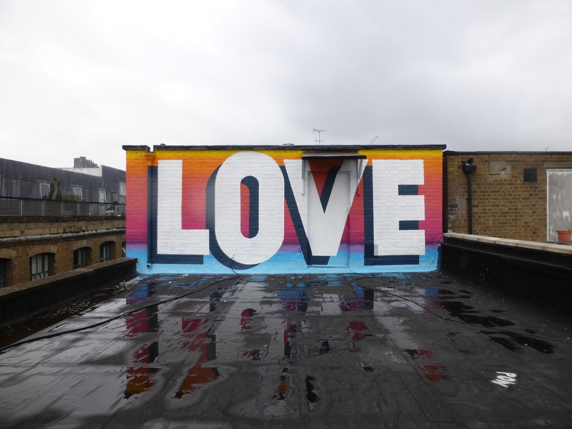 It’s a new month and yet again the Jealous Gallery has a new piece on their roof’s feature wall as a part of the ongoing Jealous Rooftop Mural Project, which continues to just go from strength to strength as the months pass. On this occasion the work is from graphic designer James Gilchrist with this simple but oh so perfect message of “Love” typography popping of the soft colour-fade backdrop. Yet again we here at London Calling Blog were fortunate enough to be let up on the roof by the kind staff of the Jealous Gallery and capture this piece to share with you all, so thank you again Jealous Gallery.