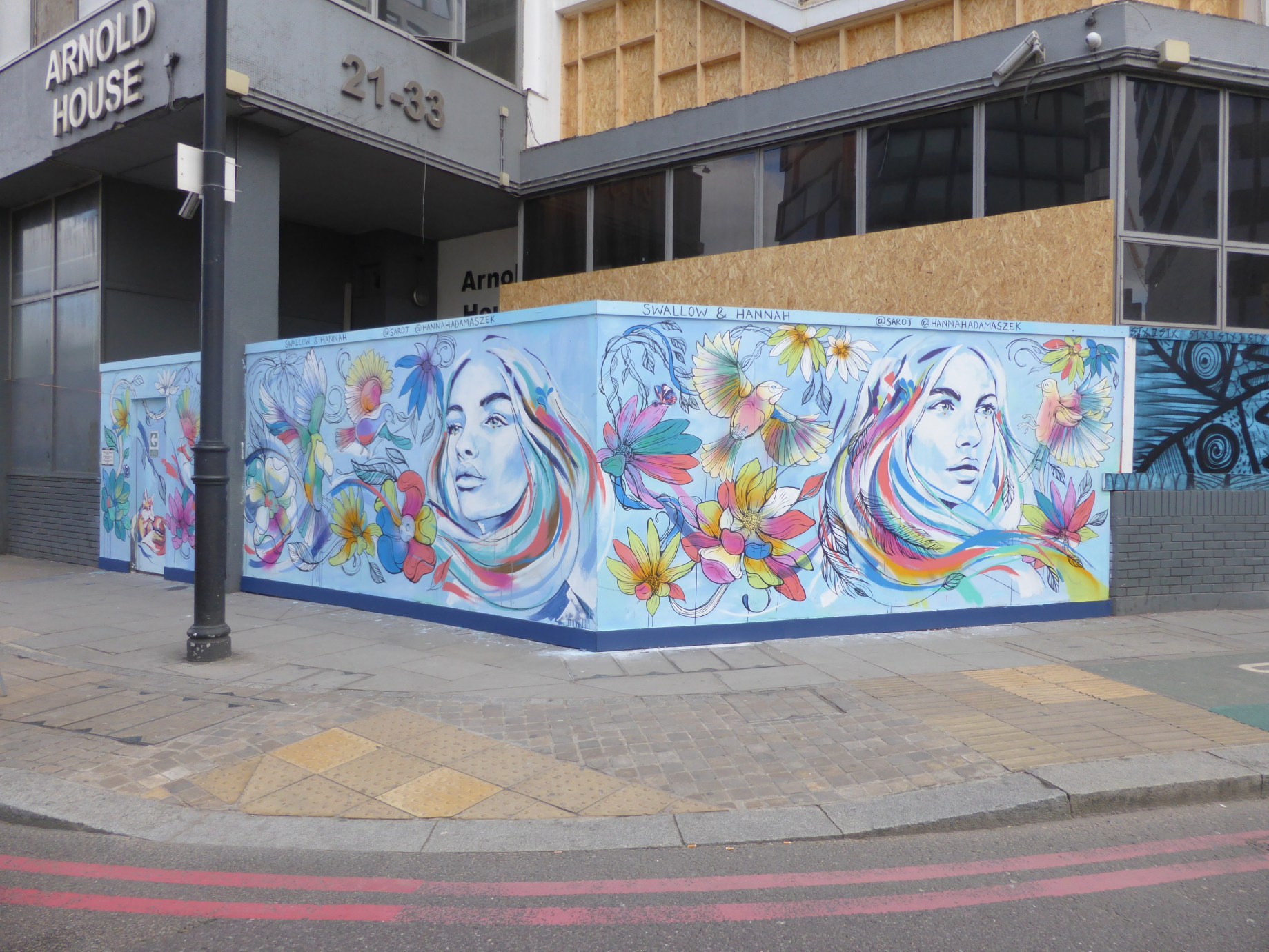 Last weekend saw the creation of a beautiful Street Art collaboration in the heart of Shoreditch with a striking work by Hannah Adamaszek and Saroj. The pair have constructed a delicate scene featuring two soulful feature portraits by Hannah Adamzsek which are surrounded by an array of wildlife presented in a soft colourful illustrative manner by Saroj, that sit so harmoniously together in this piece, Just beautiful. This fantastic work can be found along Great Eastern Street.