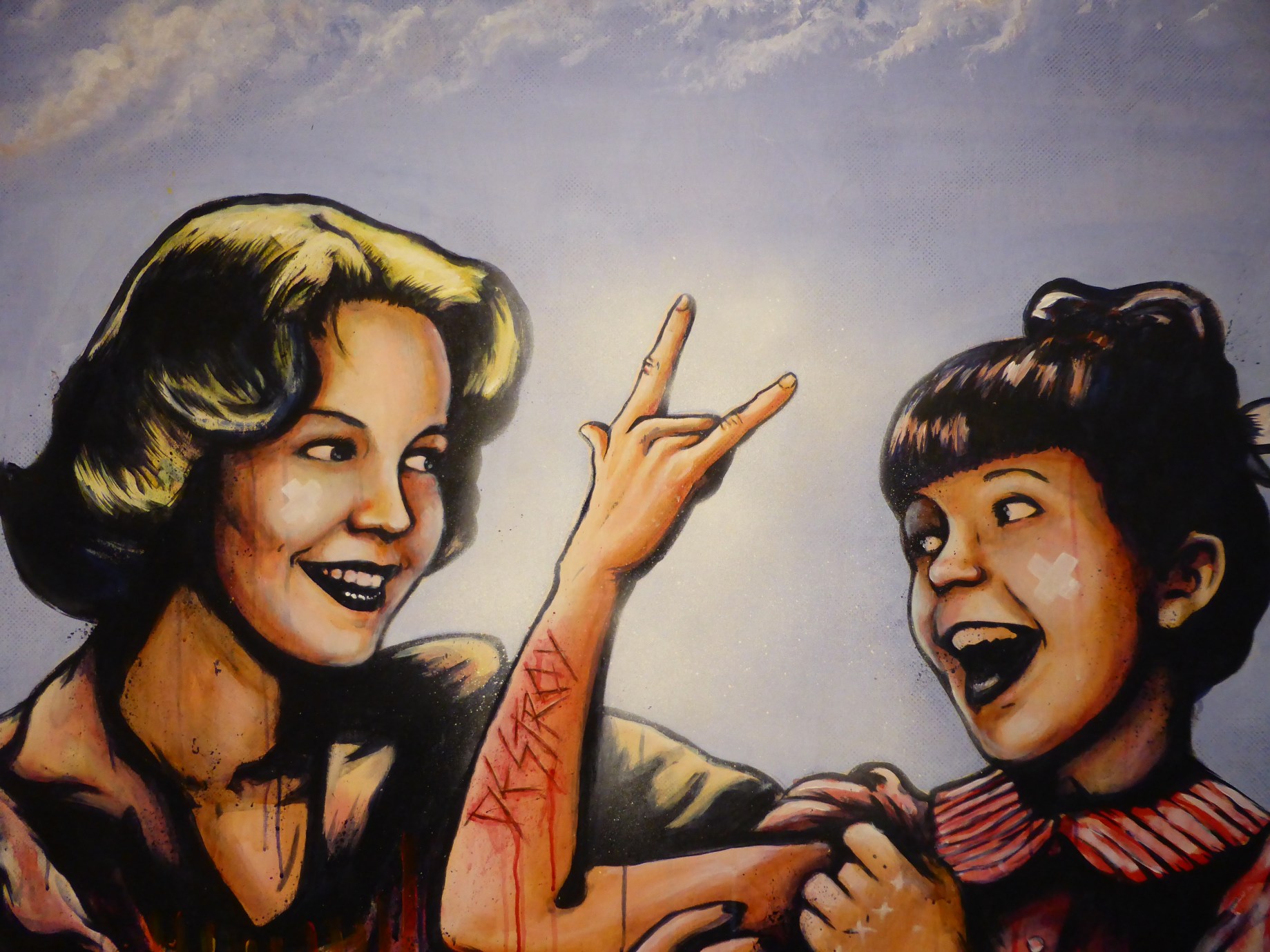 Thursday night saw the opening of the latest exhibition at the BSMT SPACE in Dalston and on this occasion with ‘Pork Loin Roast’ by the most talented Sr. X who presents a very well rounded collection of works all set to subverting the norms and traditional ideals with those all so humorous and at times dark twists that are very much exemplify Sr. X’s sense of sharp wit and fun, criticizing the over-abundance of pop culture and values it sets to install on society from above. The entire body of mixed media works within the exhibition are made created fusing transfer, stencil and freehand techniques, and all presented in that vintage style taken from 1950’s advertisements and imagery. Splitting its focus in subject from taking a look at the vanity within society and the sarcastic look at the way in which commodity culture is ingrained within popular culture and self-worth, as well as his pieces which feature that amorphic cloud of smoke in which the accompanying subject is always presented embracing and seeming grasping with this intangible subject which defines the subjects very existence. In the Sr. X’s own words the exhibition takes a look at the manner by which:
