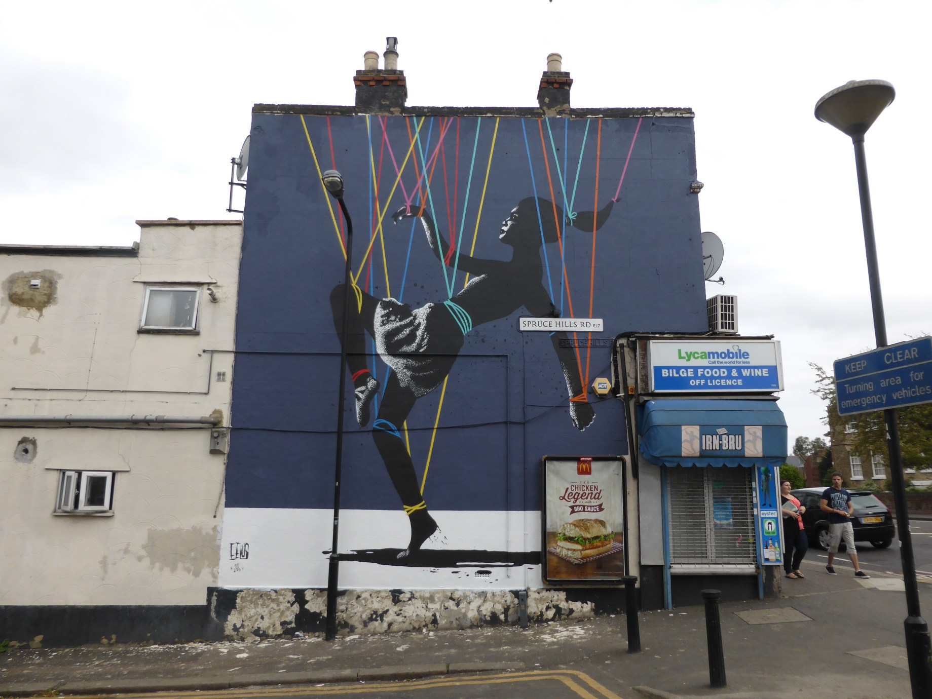 It’s been quite some time since London received a visit from UK based Street Artist Eelus, so it was quite a delight to hear that last week he hit up this striking work entitled ‘Trip The Light Fantastic’ in Walthamstow. Eelus’ work often presents a fusion of the beautiful and haunting, humorous and sinister as well as light and dark, as is the case with this new addition to Walthamstow. This very much sums up this work featuring a black and grey stencil of a woman being made to dance like a puppet aided by the many colourful strings keeping control, very much beautiful and sinister at the same time. This work can be found in Spruce Hill Road, Walthamstow, and was put up with support from Wood Street Walls.