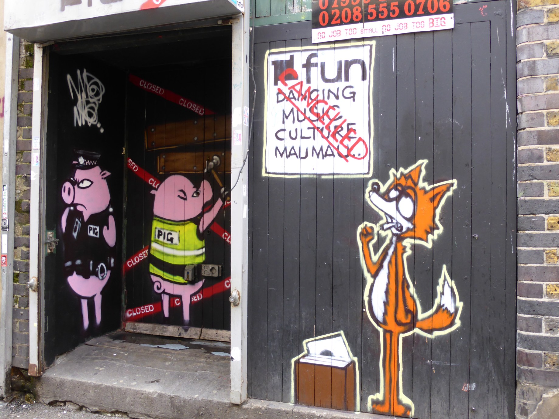 By far the favourite of our two recent works from Mau Mau in Camden Town placed up in Greenland Place and painted in support of the attempt to prevent Fabric nightclub from closure. The fun-fueled work depicts Mau Mau’s trademark Fox standing dismayed afronted by the police – depicted as pigs – closing the night club accompanied by a sign stating that “Fun, Dancing, Music, Culture and Mau Mau” are all cancelled.