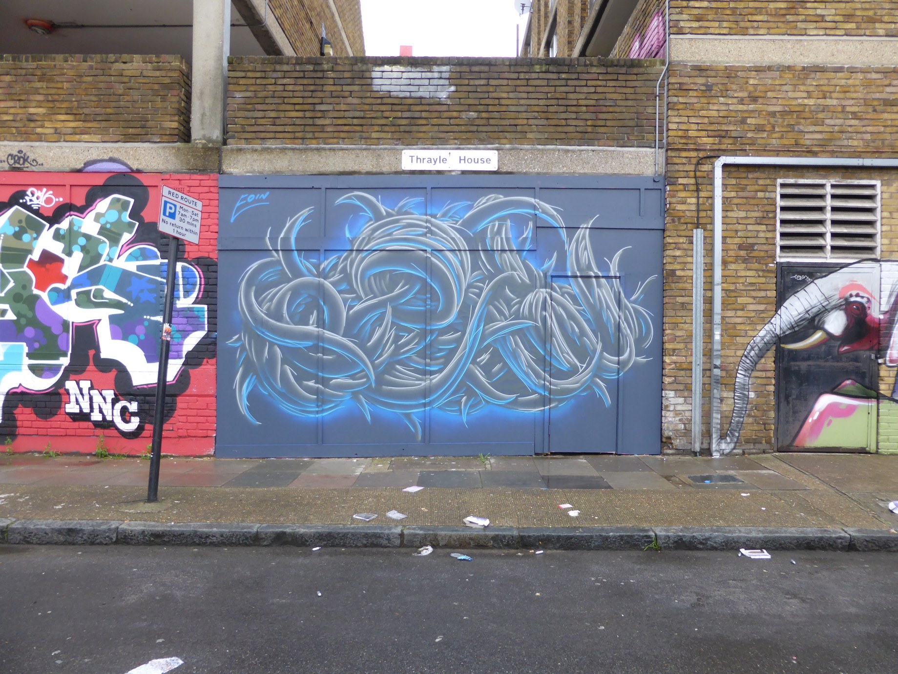Over the last month or so the now sealed off premises of the former Brixton Bloc in Stockwell have received a gradual a steady makeover from a number of Graffiti Writers and Street Artsits, some local some from abroad, who have really made the most of the space available. One such highlight so far has been the pair of hypnotic works from Eoin who was over from Ireland and took the time to blast out a pair of his trademark pieces comprising entangled air which are so full of depth and intricacy. These works were put up with support from Solo One.