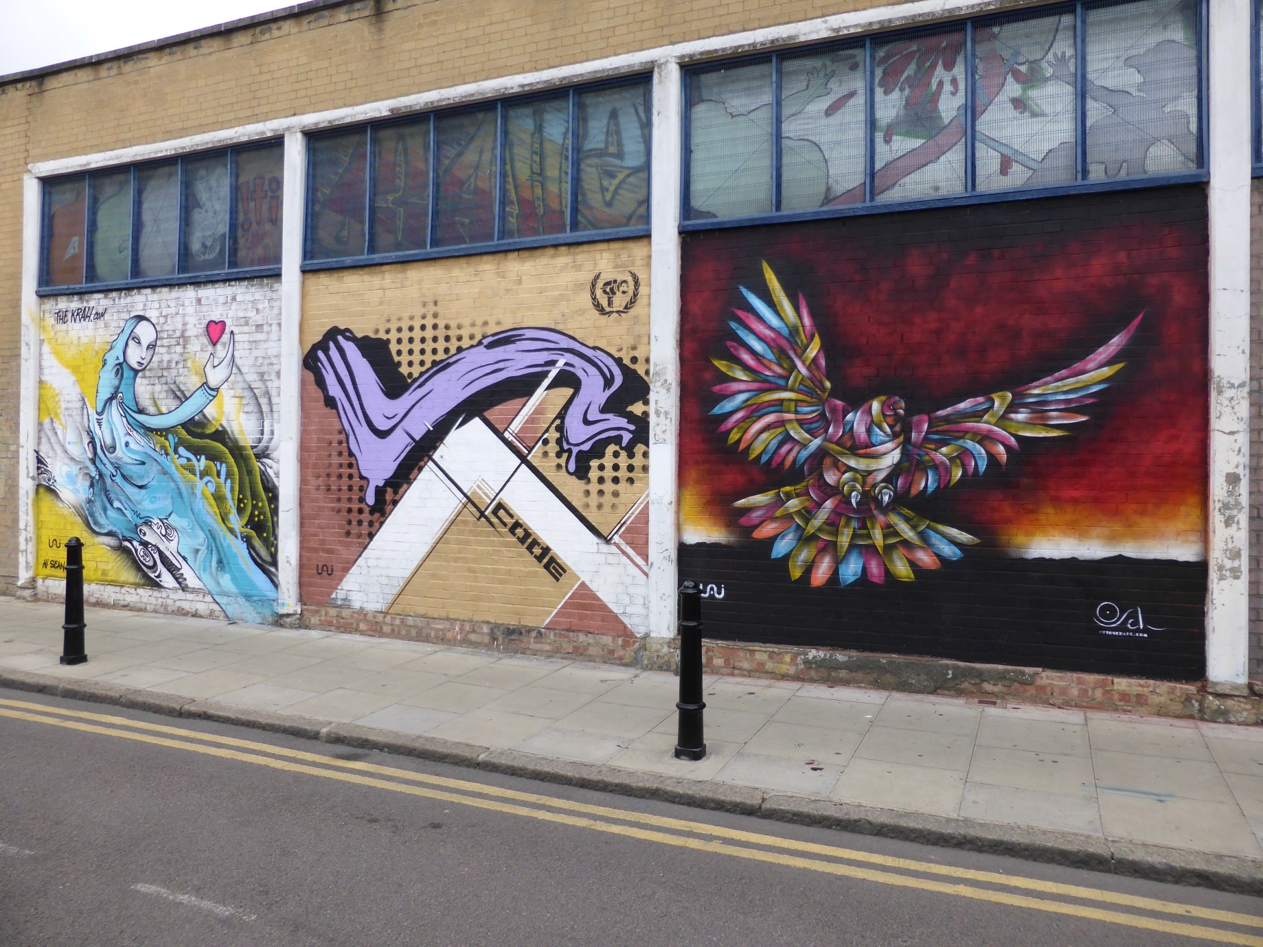 Last week saw a trio of Street Artists comprising Otto Schade, CodeFC & The Krah take to Gorsuch Street in Hoxton and hit up a trio of diverse works side-by-side. Presenting an interesting range of works, with the subtle intricacy of Otto Schade’s work, set alongside the more minimalist abstract stlye of CodeFC and the comic surrealism and whimsy that defines the Krah’s output. In all a great trio of pieces that really have brightened up this previously paint free spot.