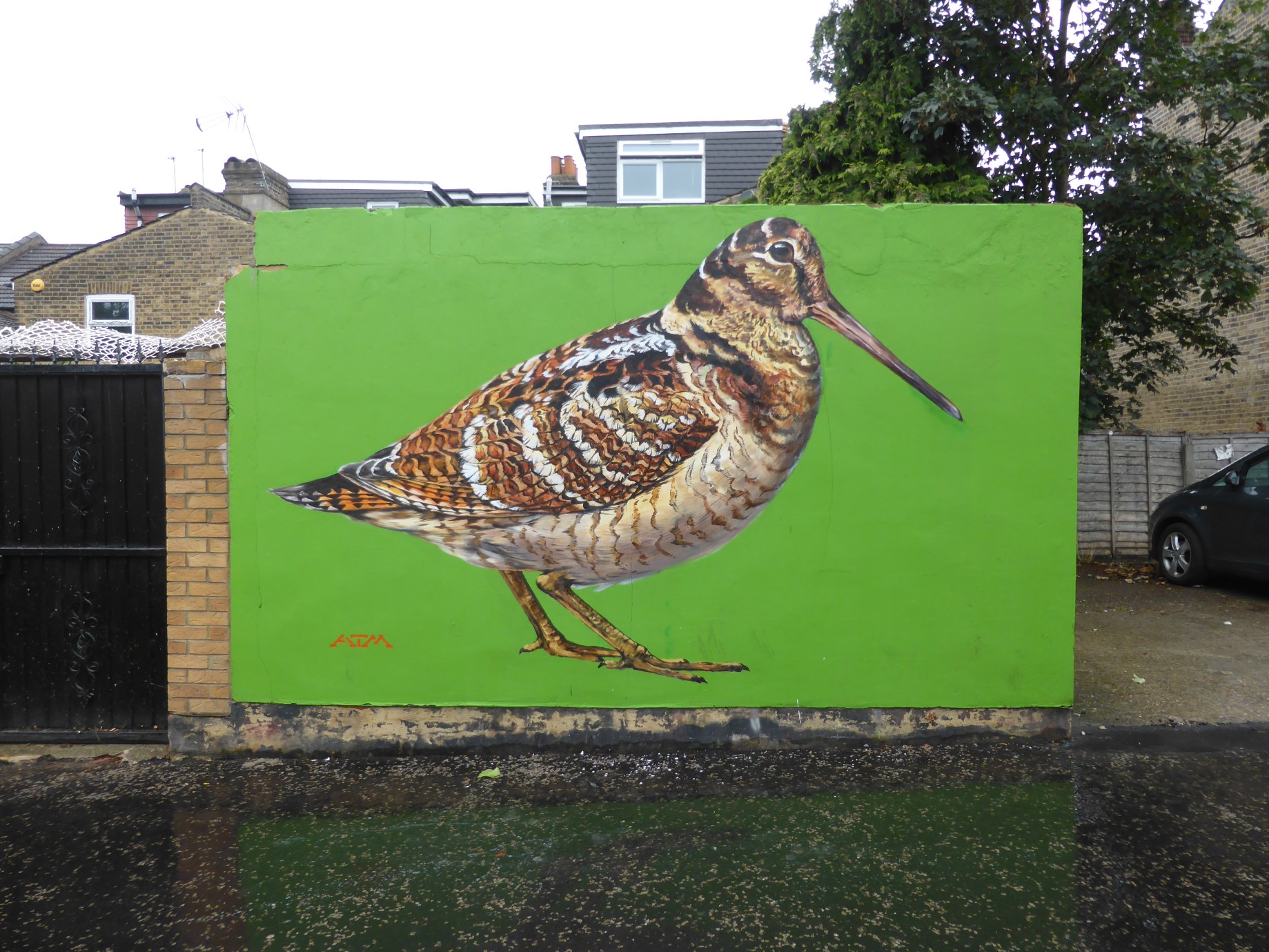 It’s been a little while since we have had the pleasure of sharing some fresh London work from ATM, an artist who we admire very much. The work is so realistic and in true ATM style, larger than life and constructed in a beautiful painterly style. Created entirely by brush work, you really can see the rich textured effect and harmonious blending of colours that bring his subjects to life. ATM doesn’t often paint his birds in more action driven stances, such as in flight, but instead tends to paint his subjects in a manner depicting them simply standing in front of you, showing a more sedate and natural depiction of creatures that should fit comfortably into the immediate environment, as this case with this striking Woodcock set on a lovely contrasting plain green backdrop. This striking work can be found in Aubrey Road, Walthamstow and was put up with upport from Wood Street Walls.