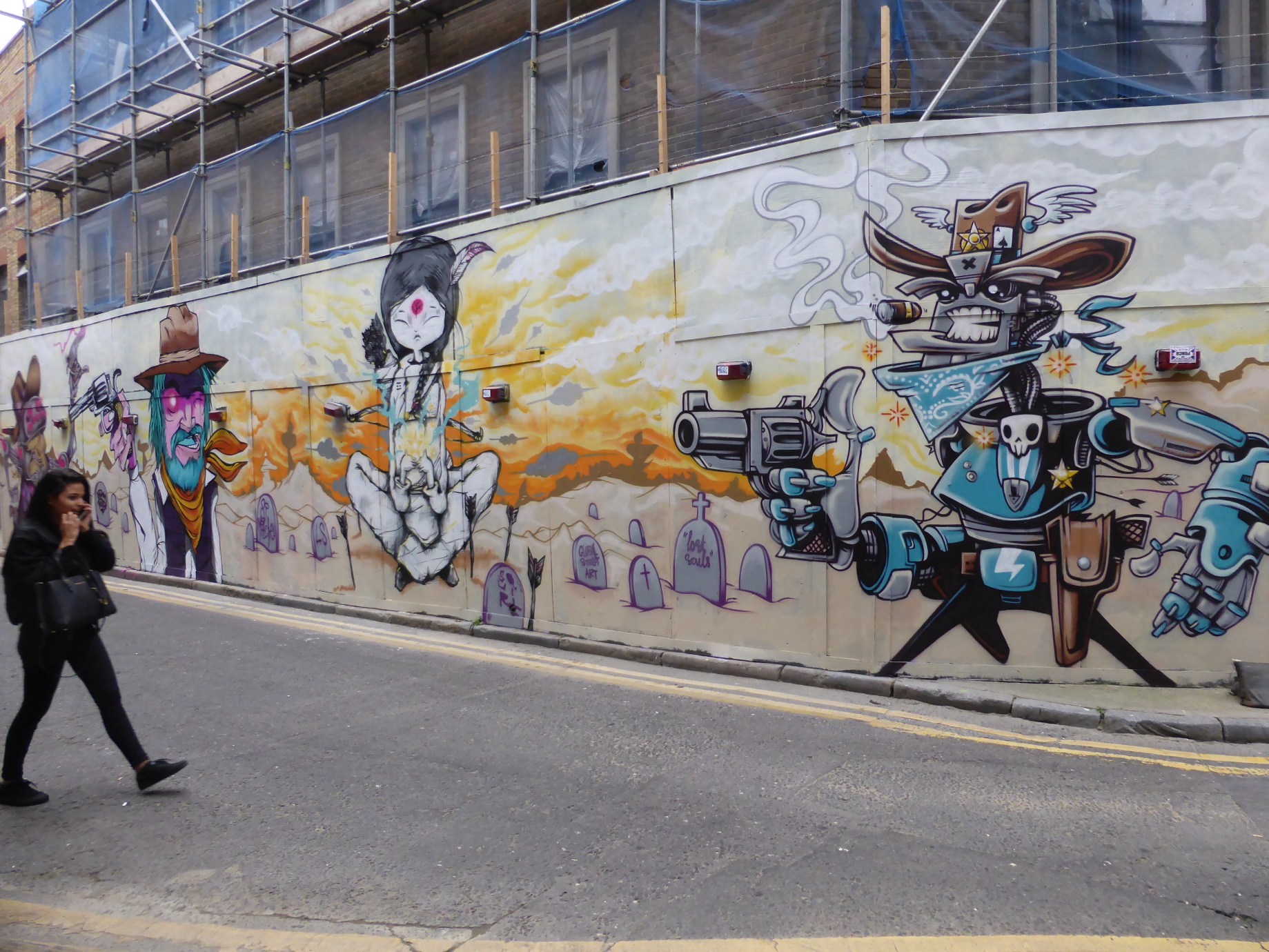 A couple of weeks back saw the Lost Souls Crew comprising; Captain Kris, Si Mitchell, Squirl & SPZero76 who as always left something fun, elaborate, well thought-out and immensely detailed in their wake, with this piece inspired by a Westworld Cowboy scene and featuring a host of gun-toting cowboys – human, robot and cyborg as well as a Native American ghost character set amid a desert scene full of cactus, grave stones – be sure to read them and the endless horizon. Always a pleasure to see work from these guys about town and this work didn’t disappoint one bit. This fantastic work can be found in Jerome Street, behind Brick Lane.