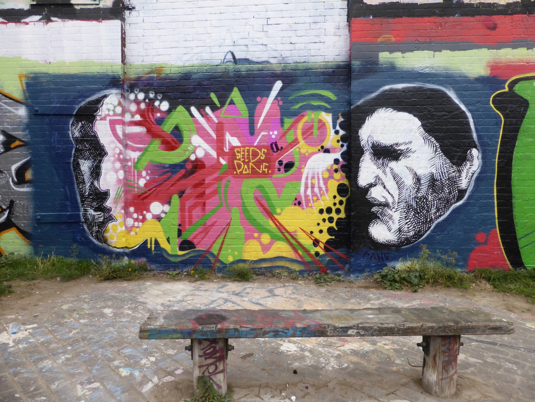 A couple of weeks back saw Pang – who is sadly no longer London based – return for a visit and hit up Hackney Wick to paint this funky fusion of styles with Graffiti Writer Seeds One along the canal. Featuring a dark backdrop and subject for Pang, the colours and explosive style present a really interesting combination for Pang’s more classical styling, it’s as if the energy in Seeds One’s work has blown Pang’s character’s mind resulting in the head being split in two. Very much a great find to spy along this stretch of the canal.