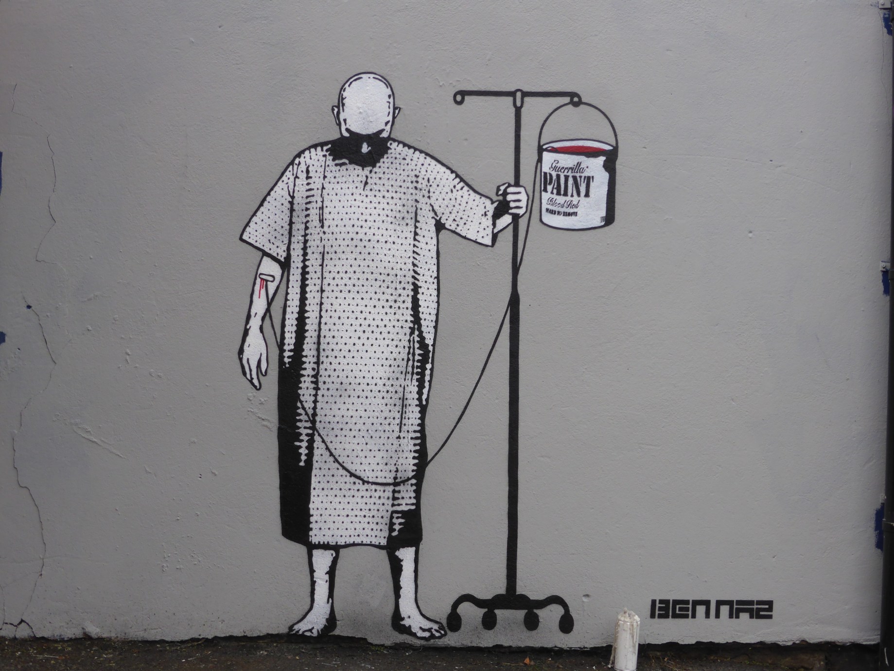 Last week saw Stencil based Street Artist Trust Icon out in West London to lay out a loving tribute to deceased friend and street artist Ben Naz, who passed in 2014 year after a long battle with cancer. The piece entitled ‘I Was Born An Artist, I Will Die An Artist’ is so very touching and in true Trust Icon style is very much his own work but clearly influenced by the subject matter, a beautiful tribute to a superb fellow stencil artist. Portraying Ben Naz fighting on against his illness and being infused with the life-giving ‘Guerilla Pant – Blood Red – Hard To Remove’ that inspired his love for Street Art.