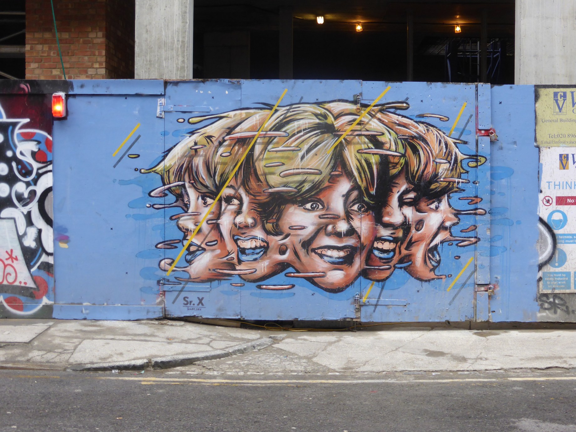A couple of weekends back saw this fantastic surreal creation from stencil and free-hand artist Sr. X entitled ‘’Tu, A Fuego…!!’, truly an artist with a style of his own who through his work sets to subvert the norms and traditional ideals with those all so humorous and at times dark twists that are very much exemplify Sr. X’s sense of sharp wit and fun, criticizing the over-abundance of pop culture and values it sets to install on society from above. In this case with the subject portrayed as the many faces of the individual and what life just might be like if one gives in to ‘the fire’. This work can be found in Leonard Street, Shoreditch.