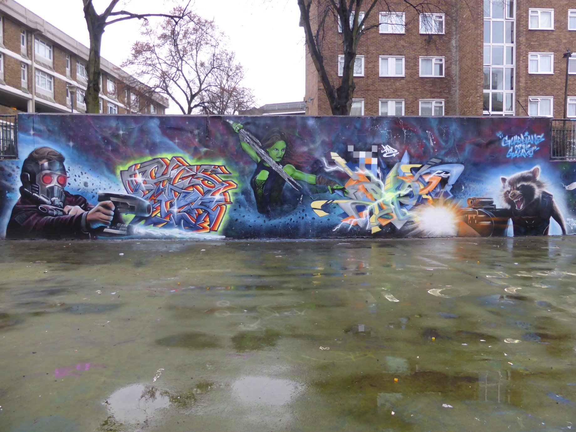 On Monday morning we couldn’t resist a trip to the Stockwell Hall of Fame in the pouring rain on our way in to work to see this fantastic production by Gnasher, Pad, Oliver Roubieu and JXC based around the film ‘Guardians Of The Galaxy’. Certainly a fantastic piece with so much going on, presenting a cast of characters from Gnasher, Olivier Roubieu and JXC placed either side of two funky tags from Pad and all set to a cosmic setting. Certainly a great fusion of character work, graffiti and all round setting, a piece that commands your attention upon viewing.