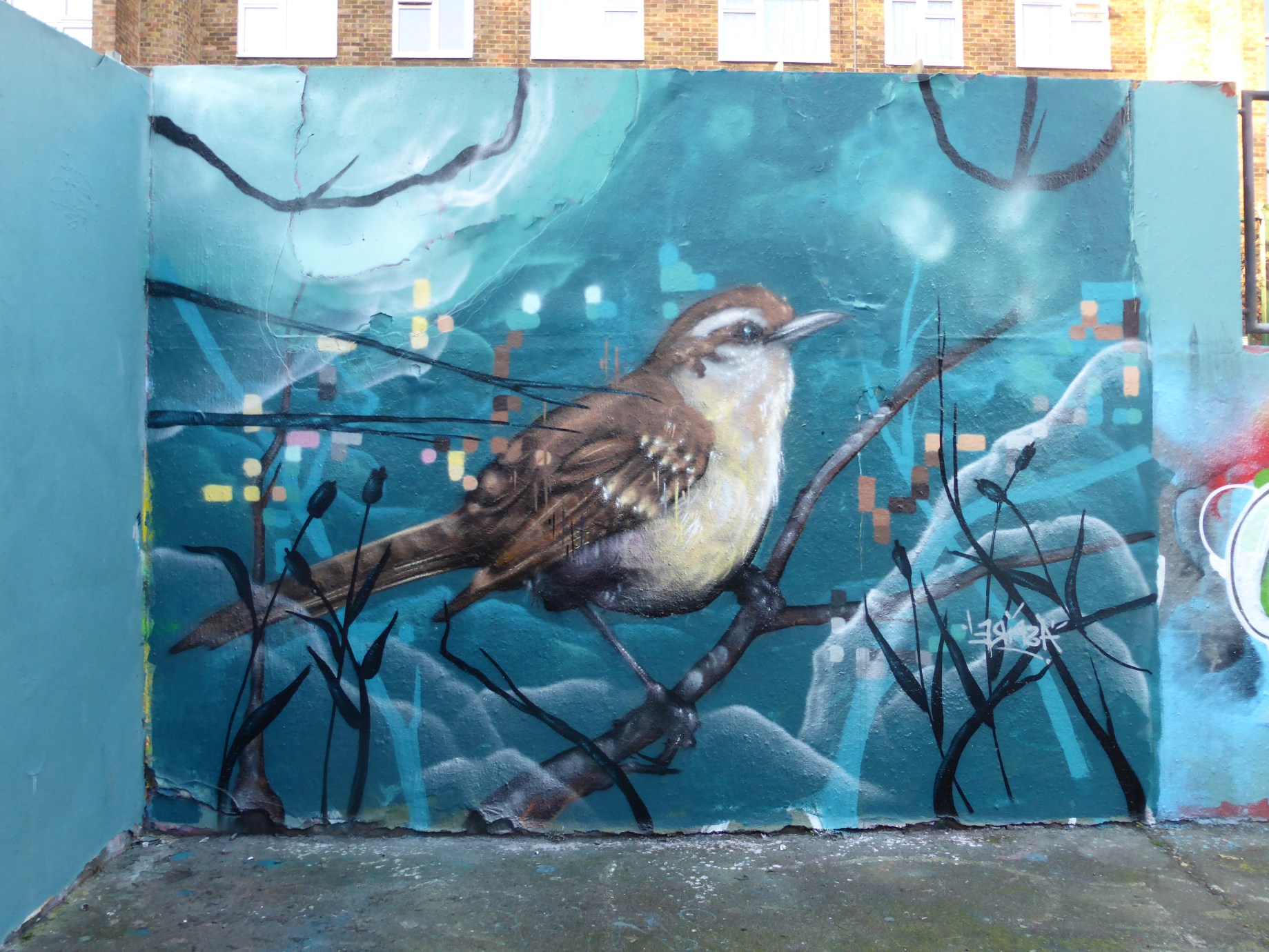 A few days back on our commute into London we decided to take a detour through Stockwell to visit the Hall of Fame in order to catch this lovely work from Street Artist Aspire. Featuring his trademark subjects of birds the delicate soft effect Aspire creates is fantastic as can be seen in this delightful depiction of a Wren with a setting which very much captures the extreme cold feeling permeating London at current.