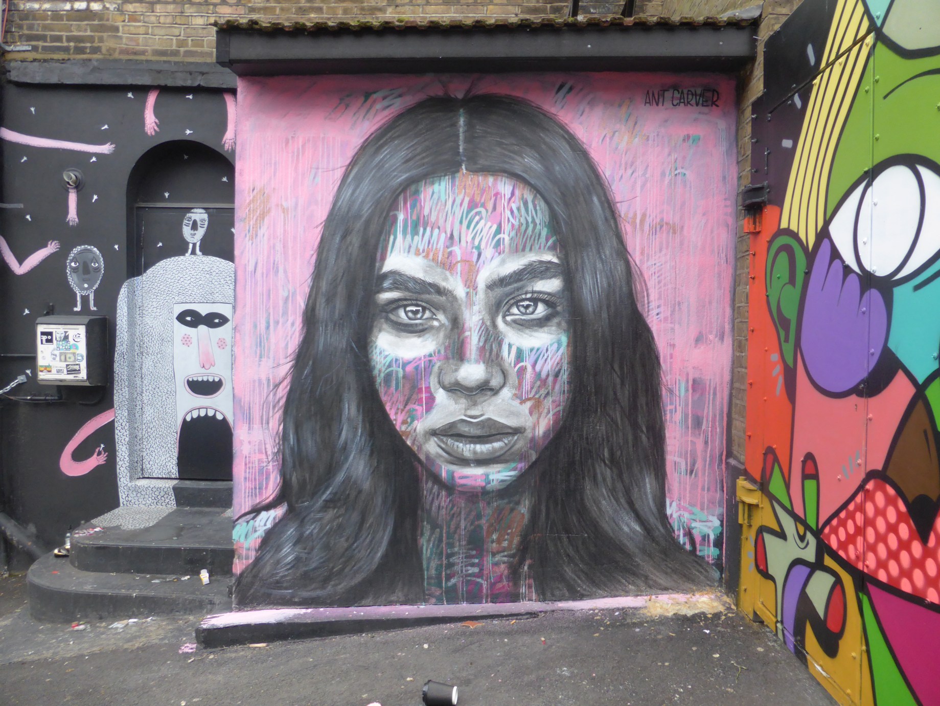 A couple of weeks back amid the brutal cold snap that consumed London Street Artist too to Camden Town to create his latest striking portrait mural. Ant Carver’s style is very distinct, comprising the colourful background taking an abstract form paying homage to his Graffiti roots. It is on this platform that Ant Carver sets to paint the detailed portraiture by brush with acrylic paints on the street. His grey-scale realistic portraits sit so well on the fluid and colourful base he composes, creating that striking effect of the beauty to be seen among the chaos. What we love most is how with Ant Carver’s works the eyes of the subject appear to be looking directly at you as you stand before the work, creating that sense of connection between viewer and subject, and this work is no exception. This work was placed up with support from The Real Art of Street Art.