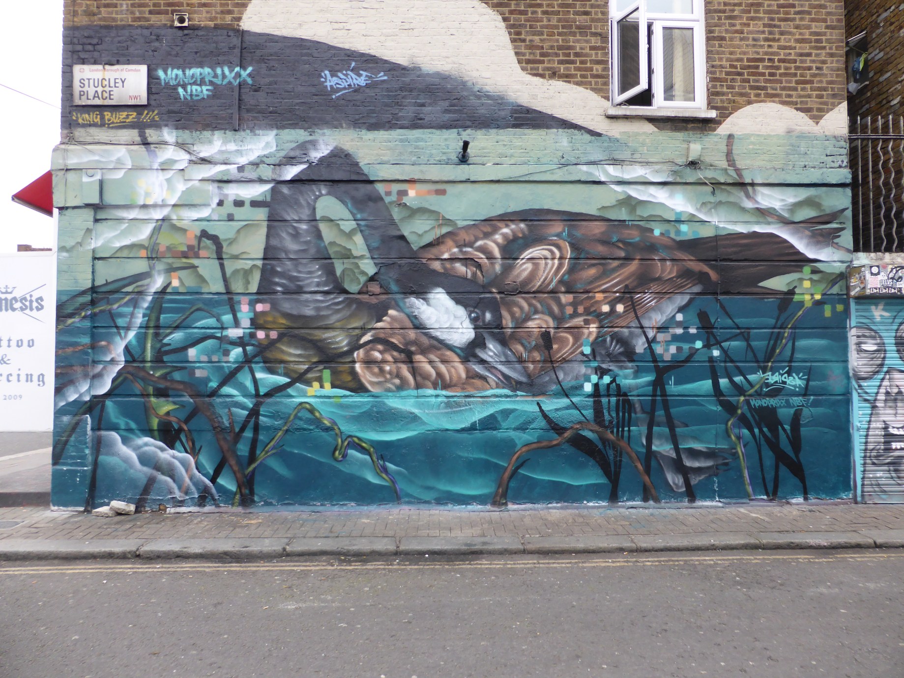 Playing catch up with the work we are sharing here. namely the beautiful recent mural by Aspire placed up in Camden Town, featuring his trademark subjects of birds the delicate soft effect Aspire creates is fantastic as can be seen in this delightful depiction of a Canada Goose which is loosely based on a plate by John James Audobon’s ‘Birds Of America’. This soulful work is so tranquil yet so full of life, truly a lovely addition to the history of great murals often to be seen on this particular spot. This was was put up with support from Monoprixx & Not Banksy Forum and can be found in Stucley Place, Camden Town.