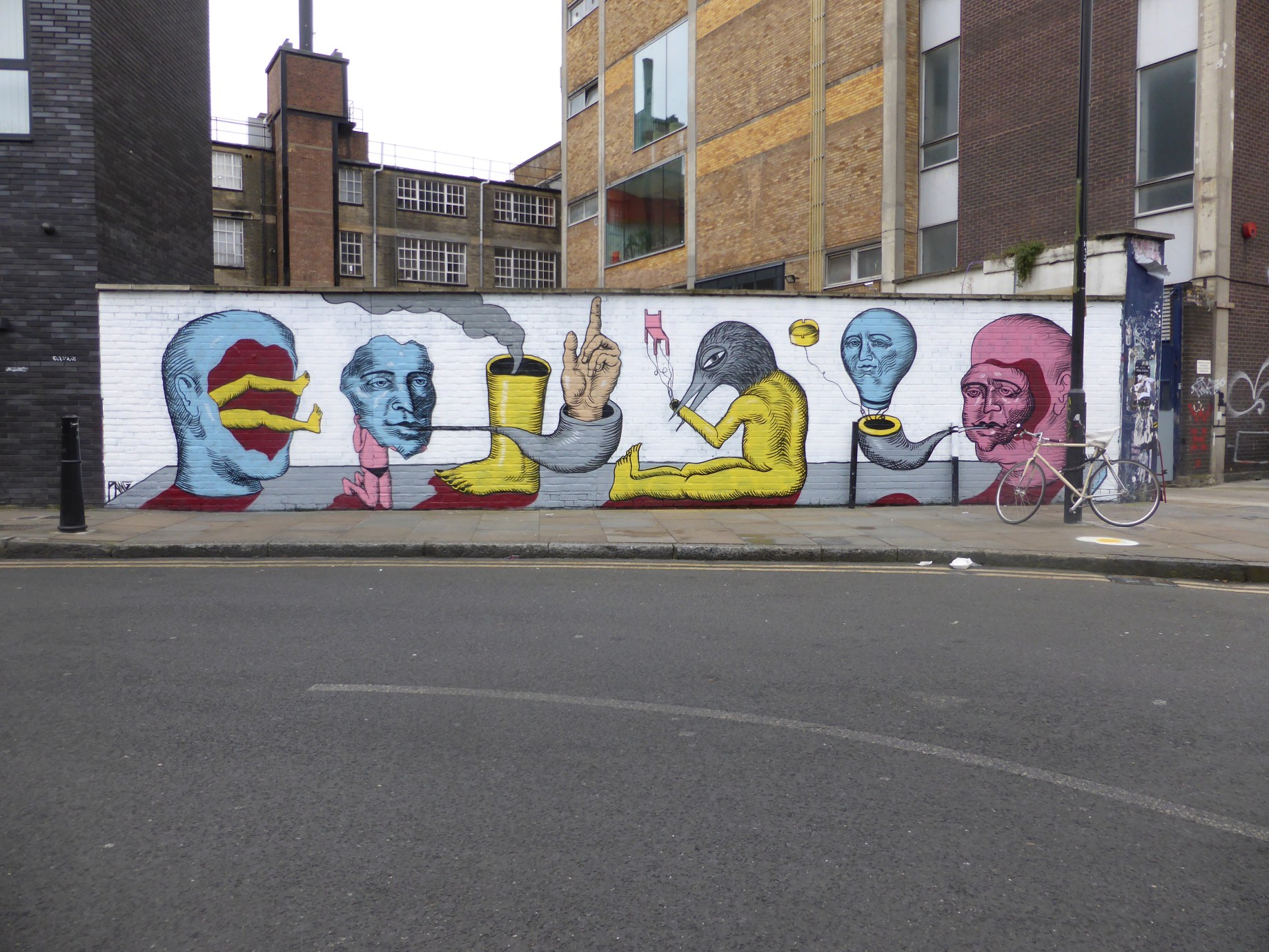 A few week back now saw London treated to a brief visit from former London based Street Artist Pang, someone whose presence and unique sense of creativity on the scene is something which is very much missed. So it made for a fantastic delight to stumble upon this amazing creation entitled ‘Carnival Of The Weird’ whilst wandering around Brick Lane. Pang’s personality is so strongly reflected in her range of styles and works, with the contrast set between wishing to take her art seriously and very much shattering that approach with her surreal and fun creations as with the latter being the case with this bizarre scene recently left in London. This fantastic work can be found in Hanbury Street, just off of Brick Lane, and was put up with support from Monoprixx & 1963 Gallery Space.