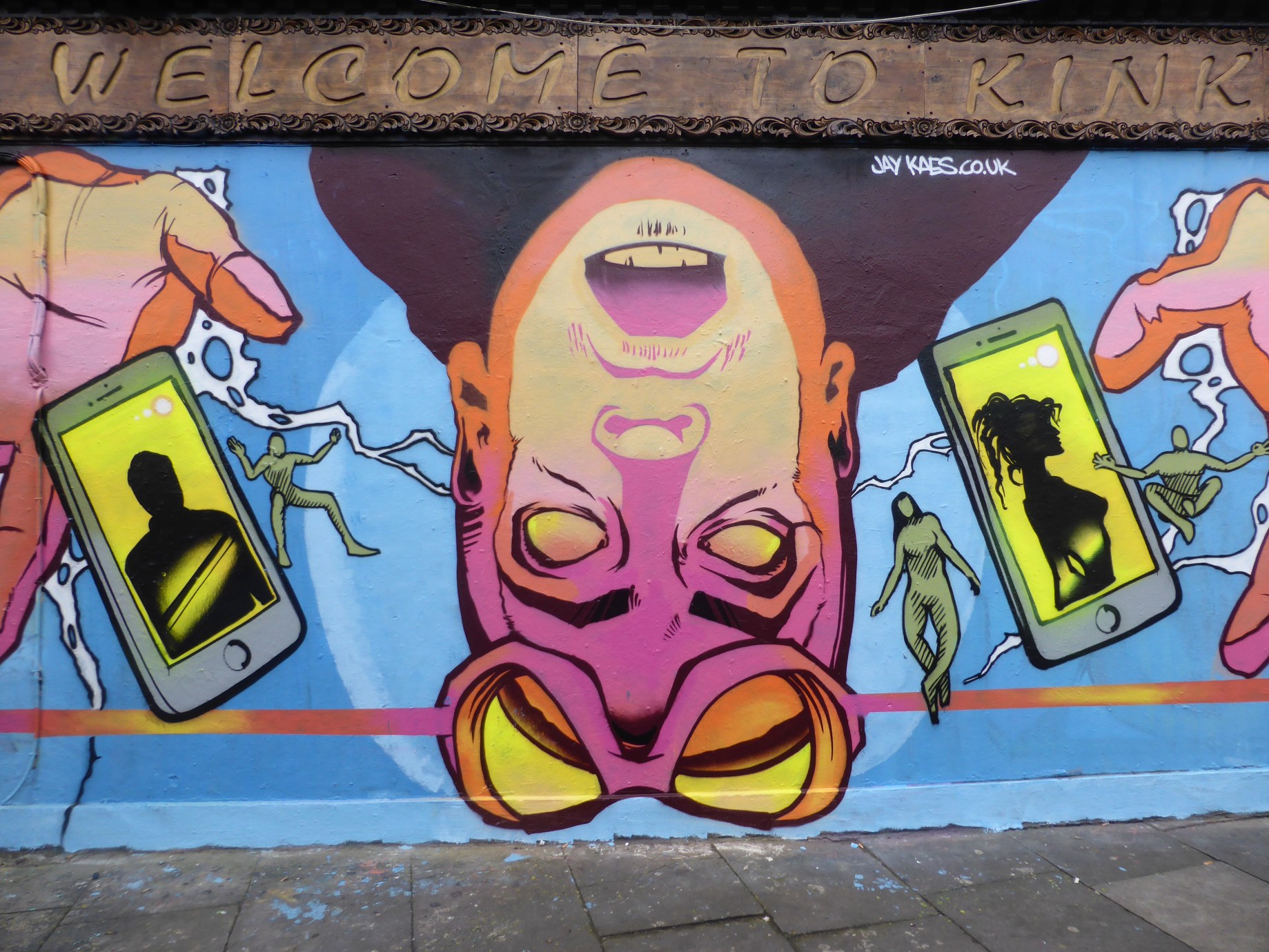 A few days back saw Spanish born, but London based Graffiti Writer Kaes take to the Kinkao restaurant wall in Pedley Street to offer this wall which sees such a high turnover of mostly fantastic artworks its latest and his second reworking – with the last work painted by Kaes two months ago (covered here). We here at London Calling Blog very much enjoy seeing Kaes’ striking character portraits, which represent a fusion of character, colour and geometry, with the subject merging into and from the background, the shapes passing through the scene and character. These characters are often depicted in an expression of gasping shock, almost as if as opposed to being the spectacle, the painting is reacting to your presence. On this occasion Kaes has continued with the theme of his last work and placed up a piece depicting a surreal and almost disturbing scene in which the perils or escapism through social media destroy the soul and mind of the individual, certainly an engaging and thoughtful piece.
