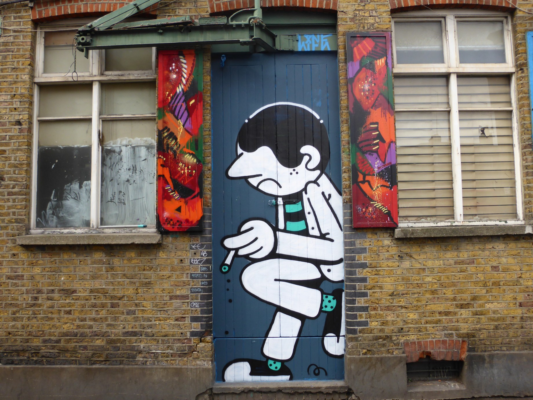 Rather casual looking subject with this work in Camden Town, depicting his character having a smoke while leaning against the doorway which is flanked by the two panels from fellow Brazilian Street Artist Decolife. This work can be found in Greenland Place, Camden Town and was put up with support from The Real Art Of Street Art.