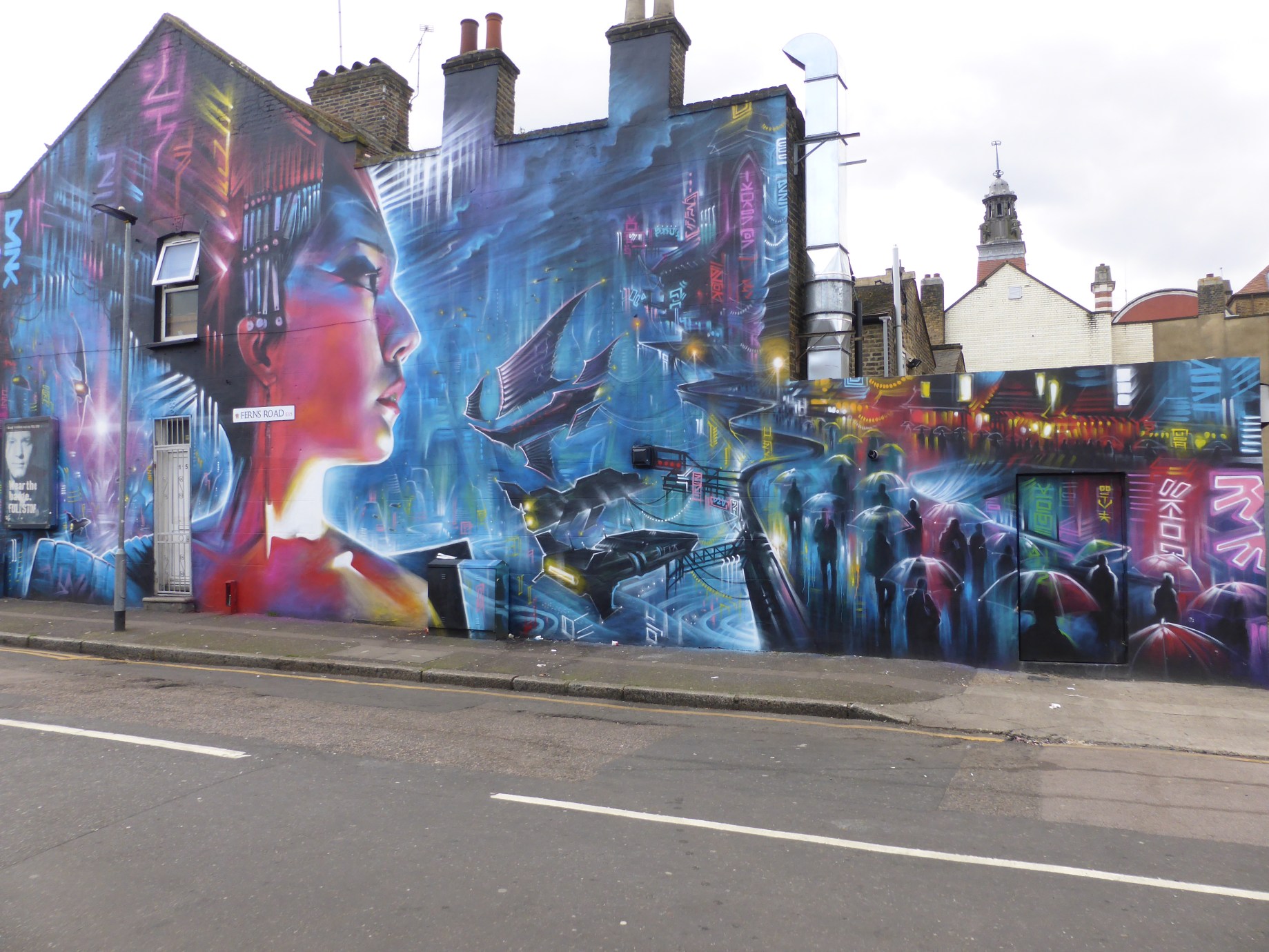 A month or so back saw Street Artist Dan Kitchener take to Stratford to paint what is the largest wall he has yet to paint in London, a whopping 75ft x 30ft surface, and certainly a work that makes exemplary use of the space available. Depicting one a futuristic vision of Tokyo as a city port punctuated by the ships and junks docking and flying around the bustling city skies in this electric world and all overlooked by the ‘Queen of Neon’ who represents the spirit of Tokyo, epitomized by the cables and neon signs entwined in her hair, becoming very much part of her construction and being. She stands proud at the centre of the city around her, the very essence of her surroundings. This stunning work can be found in Ferns Road, Stratford and was put up with support from Vikt Photography.