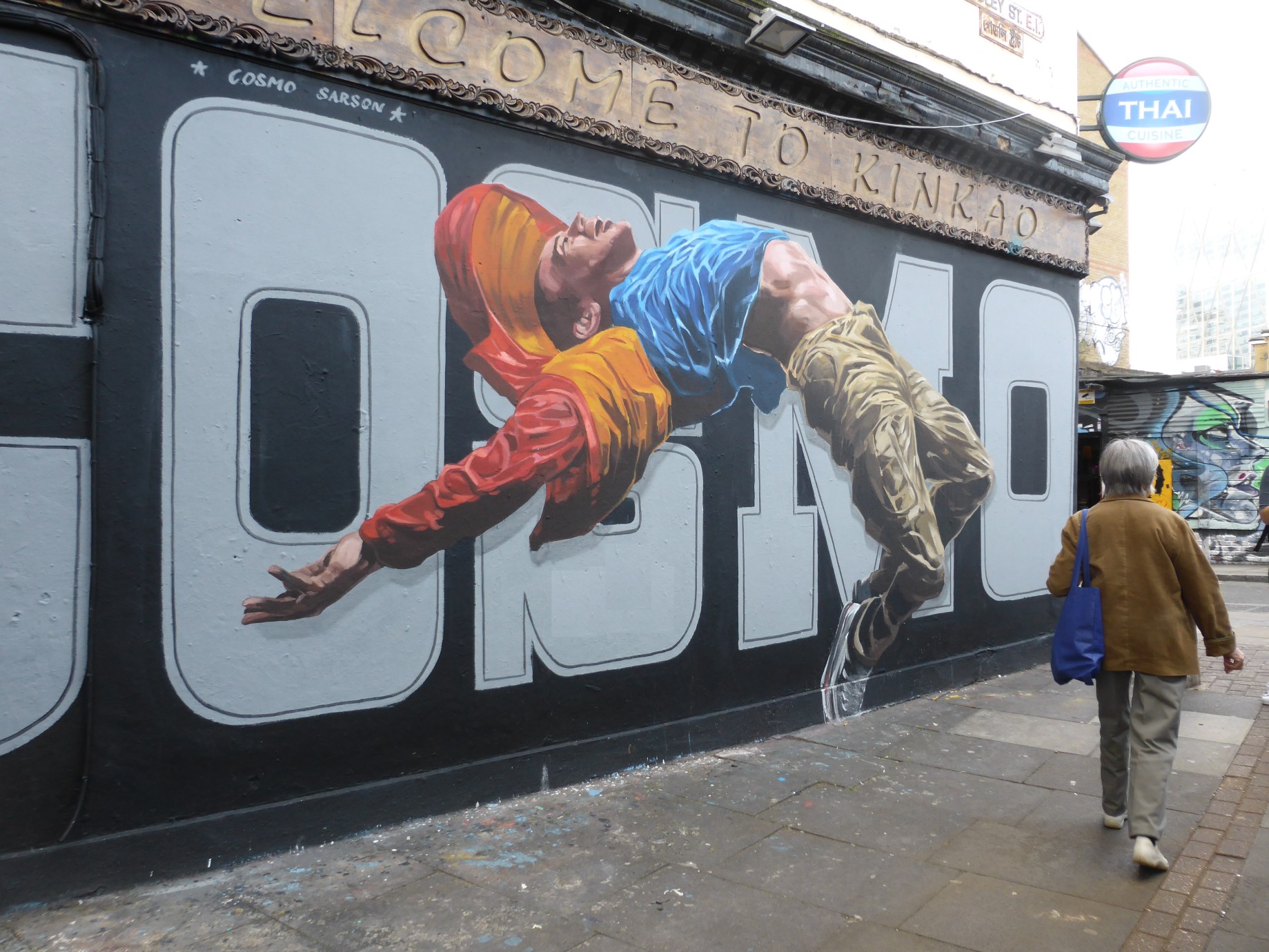 A month or so back saw Bristol based Street Artist Cosmo Sarson take a long overdue visit to London to hit up some of his fantastic artwork. On this occasion Cosmo Sarson took to the iconic Kinkao Restaurant in Pedley Street just off of Brick Lane to hit up a superb – but sadly short-lived – work fusing his rich painterly style and sense of classical religious iconography driven subjects with a simple flat Graffiti background which really sets to bring his modern day crucifix posed self-portrait popping out of the wall. Certainly an impressive work with so much depth which makes viewing the work immense fun as there are so many perspectives with which one can take in this piece.