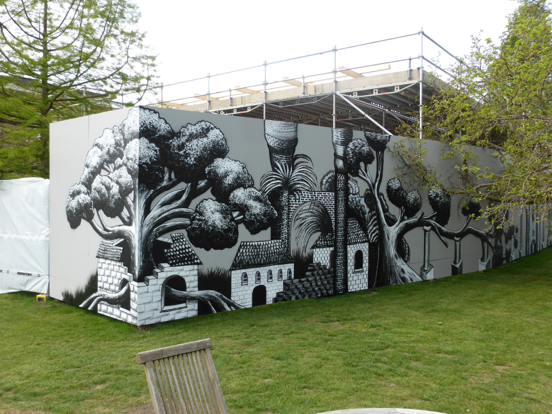 A little while back saw a pair of fresh works added to the premises of the Dulwich Picture Gallery on the hoardings surrounding their recently installed and opened Dulwich Pavilion by Street Artists Run and Phelgm, of which it is Phelgm’s delightful transient addition to the Dulwich Outdoor Gallery we wish to share with you here.