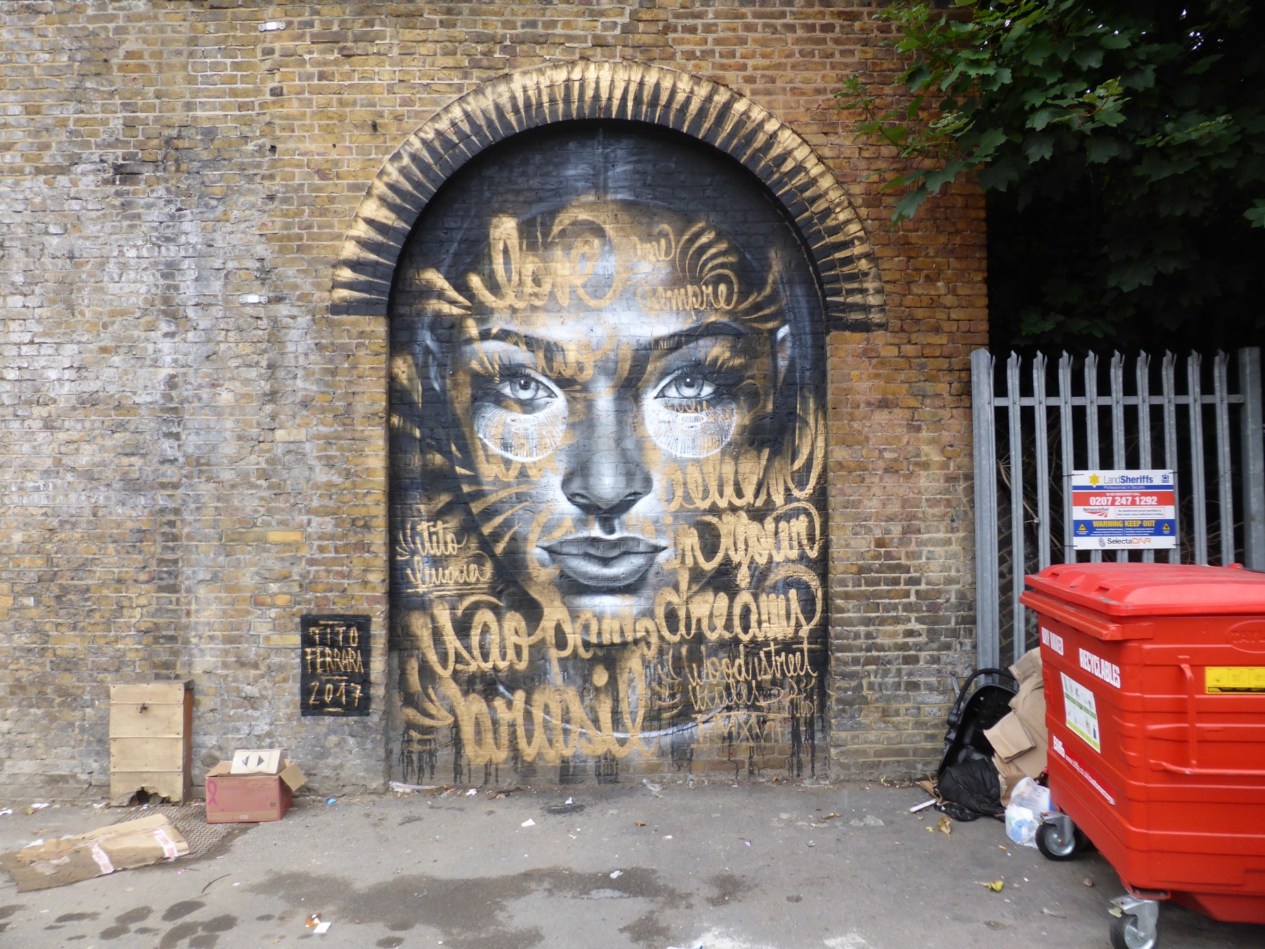 A month or so back saw Brazilian Street Artist Tito Ferrara visit London and leave us with a trio of fantastic murals dotted around East London, a pair of works around Shoreditch/Brick Lane and the third piece further out East in Walthamstow. Placing up three beautiful striking portraits – all female – set in grey-scale and overlaid with gold chrome graffiti to add some chaos amid the intrinsic beauty of his soulful subjects. Very much a delight to see an artist we have admired from afar visit London and to not leave us one bit disappointed.