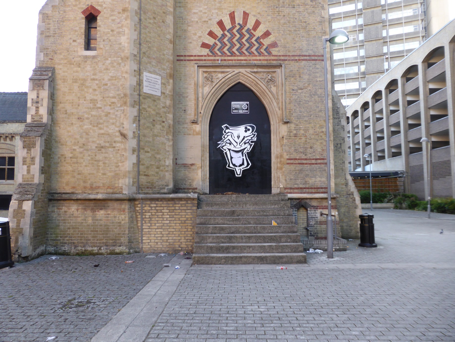 A few weeks back we were fortunate enough to catch Croydon’s very own Street Artist Morgazmik take to the Croydon Water Works in Matthew’s Yard, a beautiful building constructed in 1866 to add a funky paste-up design to the boards adorning the former entrance. Certainly bringing some character to this other wise displaced looking and sealed up former landmark its great how the characters grin just follows you all around Matthew’s Yard, sometimes you’ve just got to grin.