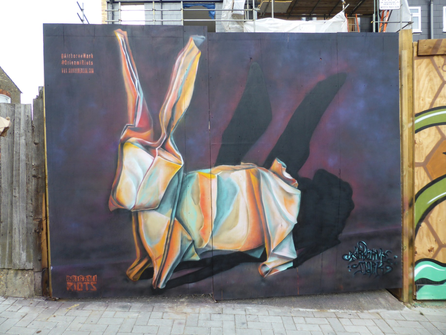 A couple of weekends back we had the pleasure of taking to Ardlui Road, a quiet rather fancy residential street in West Norwood in order for Airborne Mark to add to our now gradually expanding SprayExhibition20 Community Street Art Project, allowing Airborne Mark the chance to work his case studies in light and shadow through his favoured paper platforms. On this occasion the work features a design of a Rabbit folded by origami artist Ross Symons who sent the design from South Africa for Airborne Mark to bring it to life on an urban setting. Certainly an impressive work very well suited to its new home and in our view one of Airborne Mark’s best works to date.