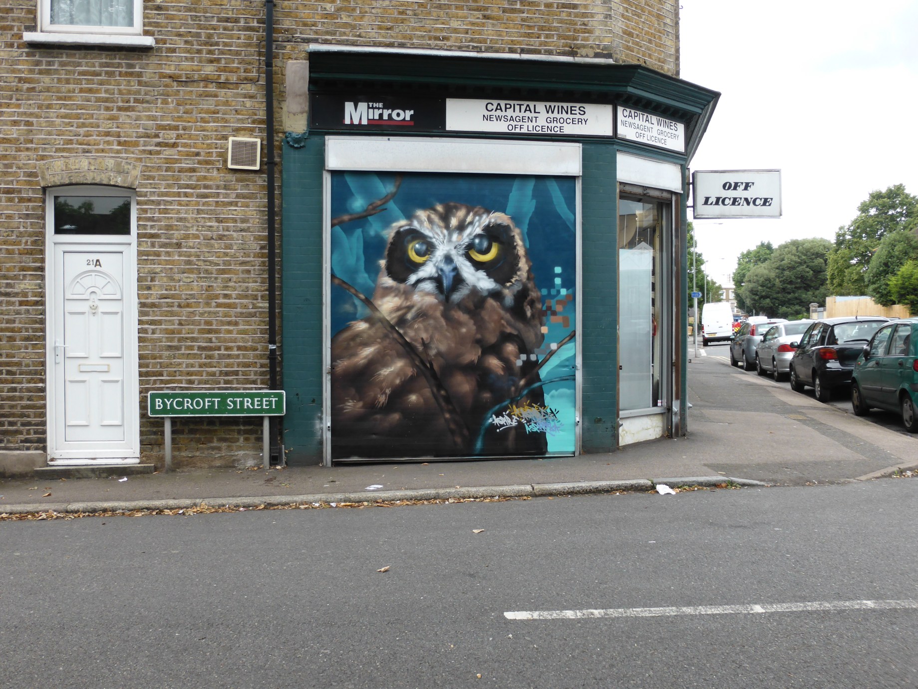 Finally after catching up on many of the works we have been late covering we are now sharing a work with you placed up a mere few days ago with a look at Aspire’s second addition to Penge for our SprayExhibition20 Community Project. Taking into account that the work is on a shutter so with the opening hours of the business will spend much of its life on display in the dark Aspire decided to paint a Little Owl of the nocturnal persuasion depicted with the delicate soft effect of Aspire’s style which we admire so much. There is so much life and warmth in Aspire’s creations and we are sure you will agree with us when you see the work below.