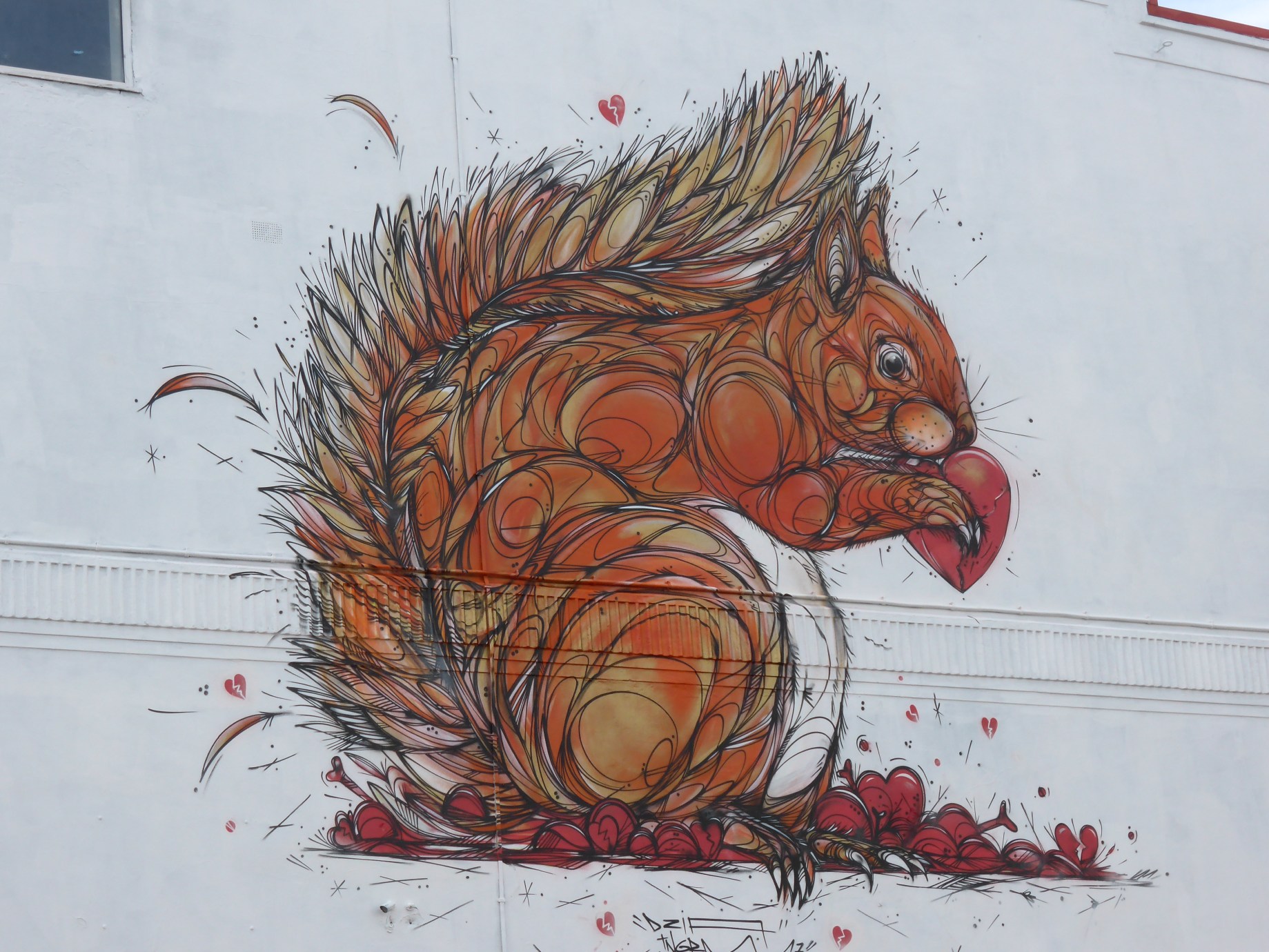 So first up we thought we would take a look at an artist who put up not one, but two fantastic works about town for the festival, namely DZIA, who whilst over from Belgium took on one of the events feature walls at the Redpoint Climbing Centre and once finished took the time over the weekend to paint a smaller but no less impressive work along North Street. DZIA’s work features depictions of exceptionally detailed animals with his signature style defined by his use of bold abstract and geometric lines overlaying his work that really bring his pieces to life and this is what DZIA has so very well done with his delightful pair of recent additions to Bristol for Upfest 2017 on these occasions a Squirrel and a Robin.