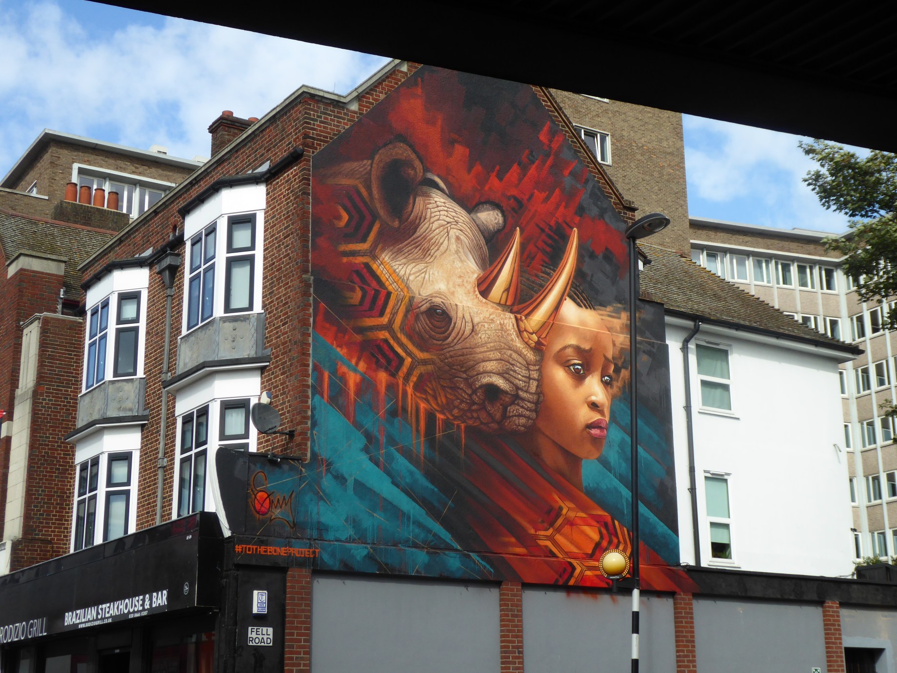 A few weeks back saw London receive a visit from South African Street Artist Sonny who placed up a spectacular and poignant mural for his ‘To The Bone’ Project which sets to draw awareness to as well as raise funds for endangered species around the world before it is to late. To this end over the last year or so Sonny has taken this project around the globe with a prolific series of large-scale murals placed up in villages as well as cities and all paying homage to these beautiful creatures that are so crucial to the harmony of how the planet exists. With his latest addition to the project placed up in Croydon the work sets to focus on endangered Rhino, which have been prolifically hunted to near extinction for their value in the ivory trade, with this in mind Sonny has presented a work featuring a rhino and a child set harmoniously side by side, highlighting that it is the children of the future who will miss out once such creatures are no more than a rare specimen in a zoo or photograph in a book. This outstanding work can be found in Fell Road and was put up with support from IFAW UK a non-profit organization dedicated to the rescuing and protecting of animals around the world.