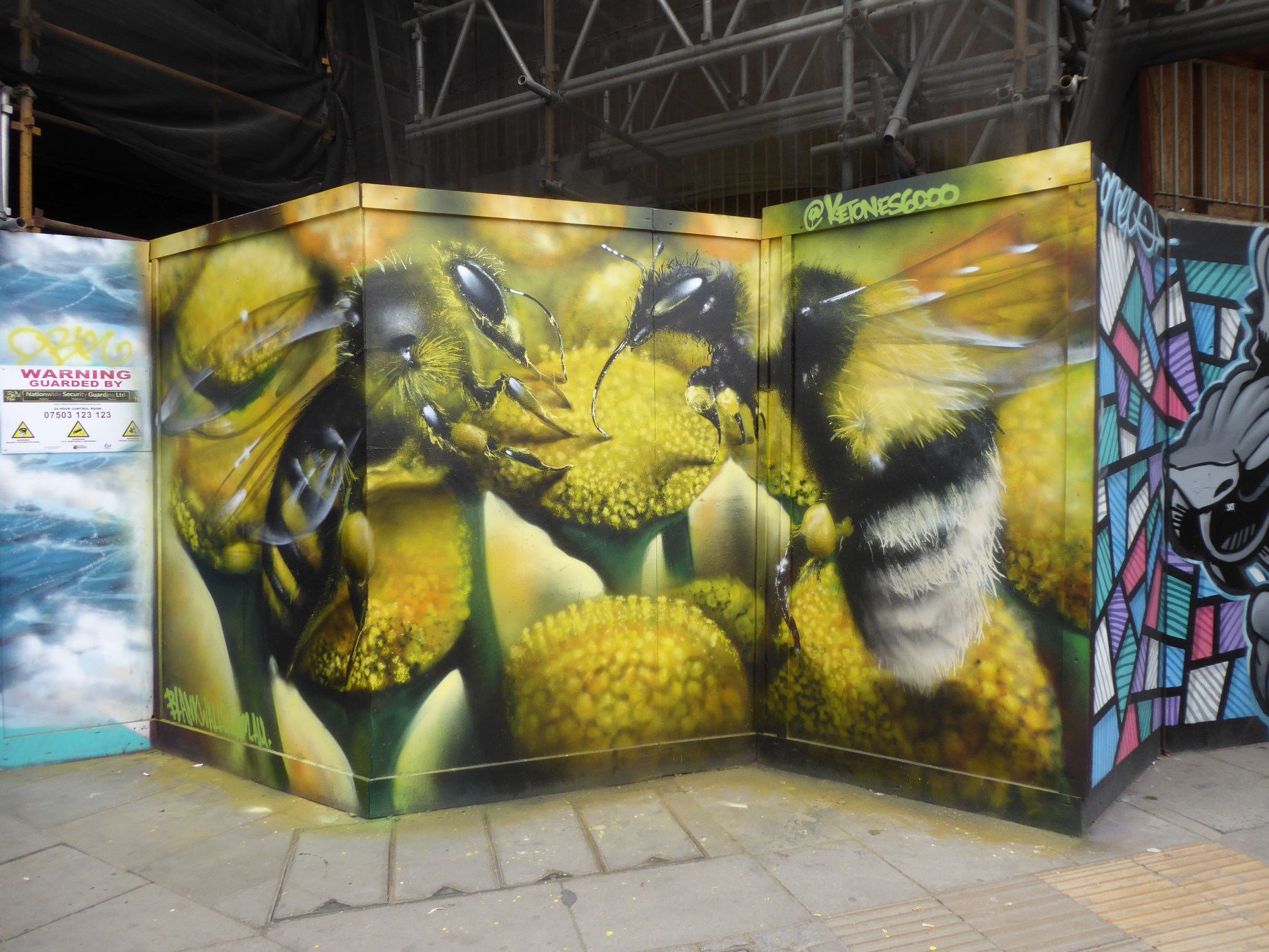 Street Artist Ketones6000 was pretty bust the other week, painting a pair of beautiful works around Shoreditch and Brick Lane, both featuring bees with plant life and in one case incorporating striking grey-scale portraiture which is proving very prevalent in his output at current. Very much a beautiful pair of works and an artist we are delighted to see is capitalizing on his time in London and treating people to his art.