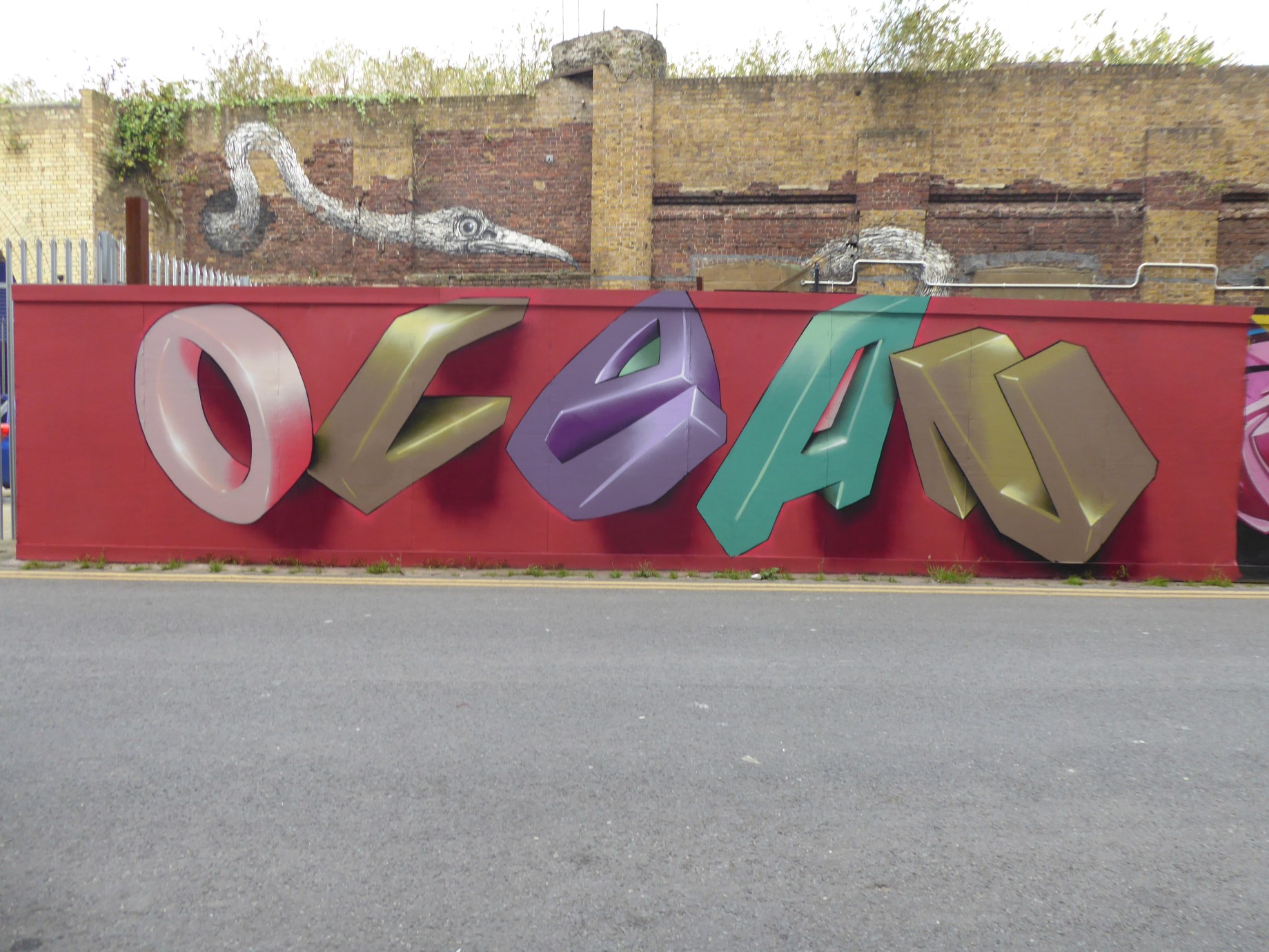 Yesterday on our way home we made a detour to Brick Lane and among the few visual delights we were fortunate enough to stumble upon was this fantastic work from 3D Graffiti Writer Lovepusher. Having began painting in 1995 and since then transitioning from painting a more traditional urban form of typography to his current futuristic 3D creations, in the process developing his own glowing style of painting using light, shade and perspective in order to make his works pop off the walls on which they adorn. What is immediately noticeable about this work is how Lovepusher has taken a break from his prevalent ‘Jesus’ tag and took the time to experiment with some new words, on this occasion ‘Ocean’, creating a piece that further demonstrates how versatile Lovepusher is with his exceptional typography skills.