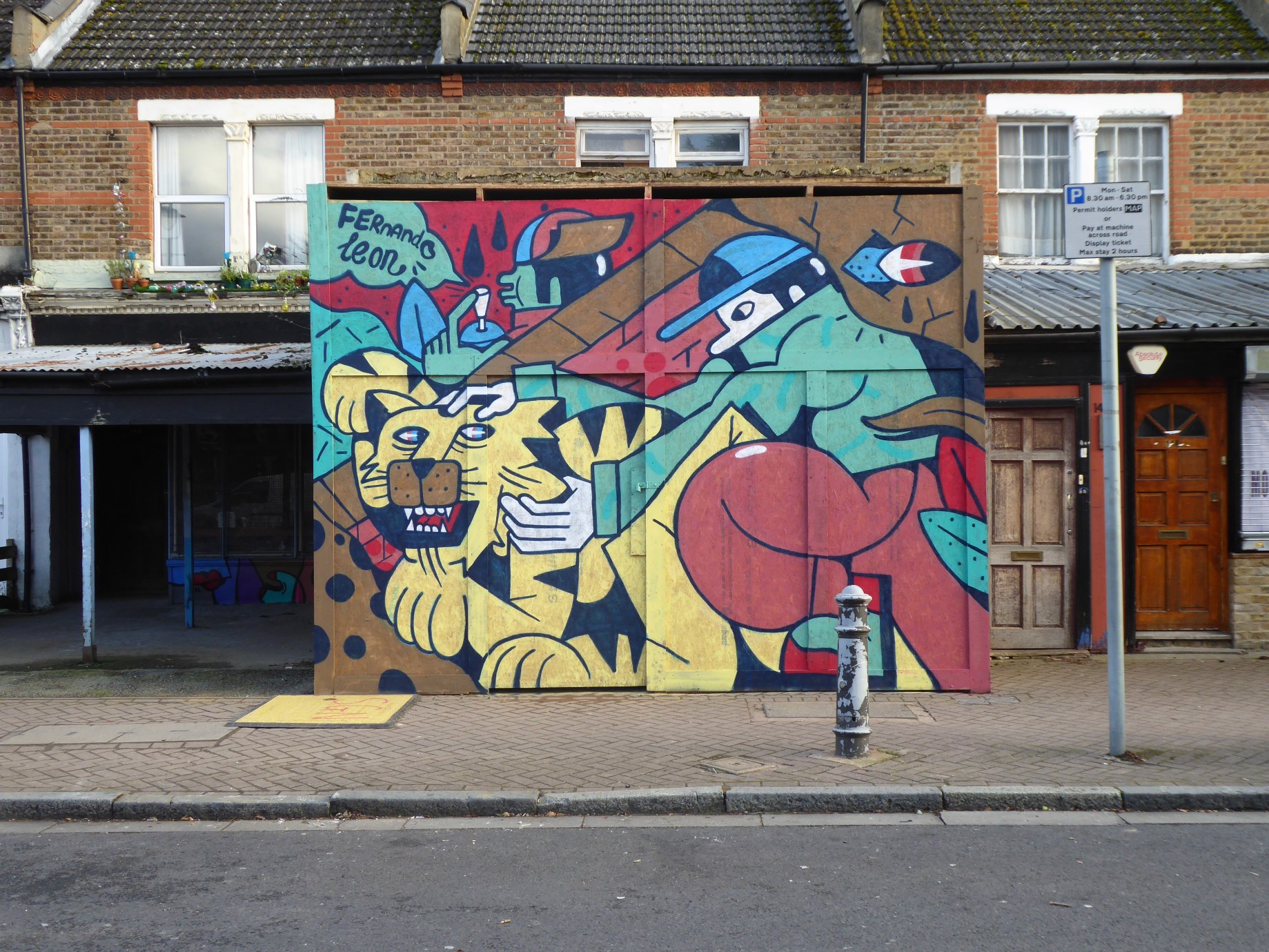 A month or so back saw London receive a brief visit from Colombian born, but Dutch based, Street Artist Fernando Leon who whilst over took the time to come paint a single London mural in Penge for our SprayExhibition20 Community Mural Project. Taking to Maple Road to showcase an interesting style of surreal illustration driven work presenting a host of characters in a minimal sedated colour palette, on this occasion with a pair of male characters set hugging a tiger, it is very much a pleasure to see something so different pass through London’s walls. We would like to say thanks to the kind owners of this space for allowing us to facilitate Fernando Leon in adding something so beautiful to their property. We also would like to offer a big thanks to Fernando Leon for taking the time to come down to Penge to add this delightful work to the area on his brief visit to London.