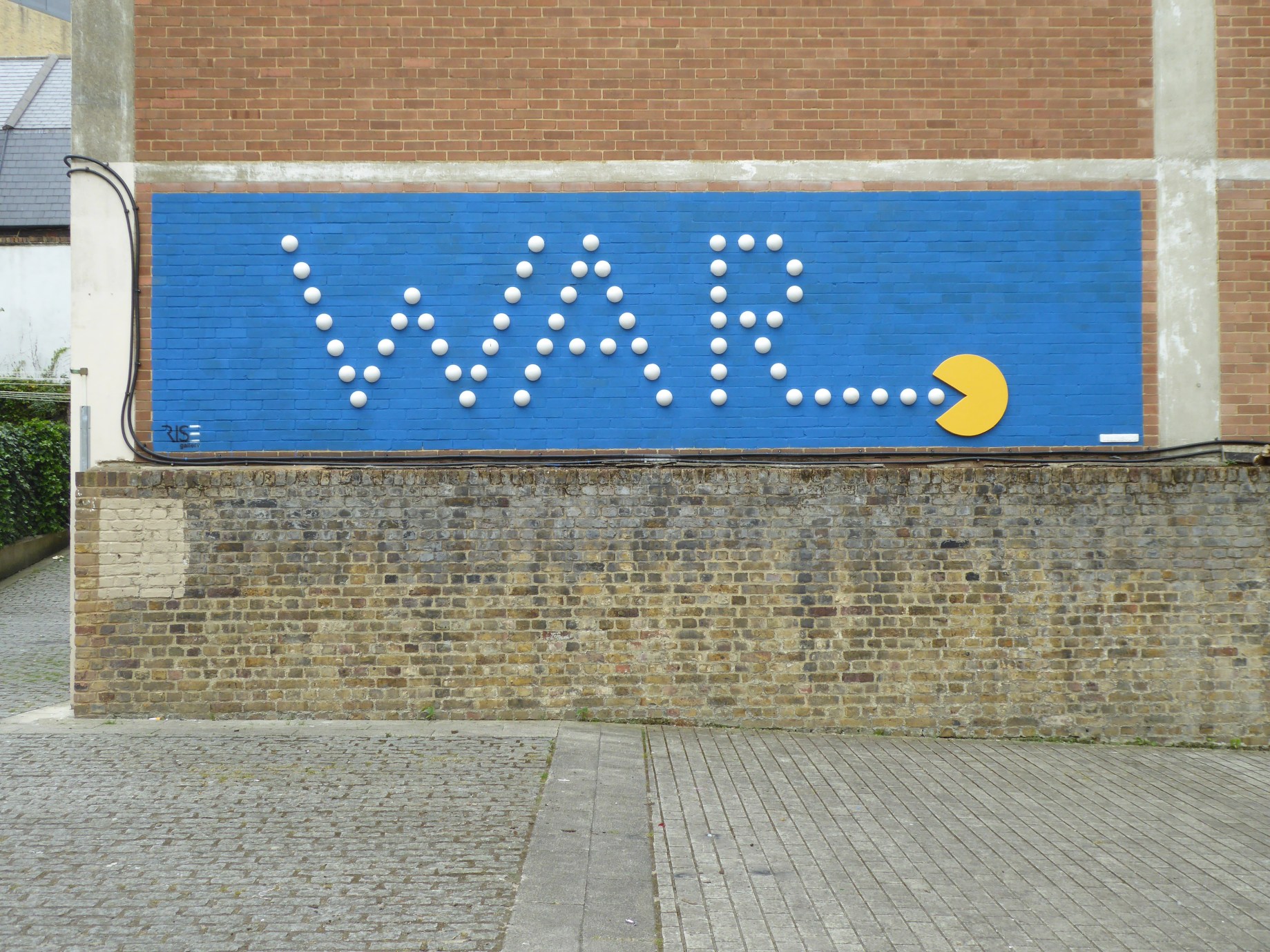 Last month saw London receive a visit from Italian Street Art duo Urban Solid who have left their largest installation artwork placed in the city to date. The duo started their project on the urban setting in 2010 with a predilection of utilizing derelict and unused walls to present their work within the context of urban decay, which ties in with the ideas conveyed in much of their work, that we are being watched, monitored and observed, taking a very Orwellian stance and setting to mock the condition of the modern human in the age of Big Brother. For this particular design entitled ‘Pac-WAR’ iconic and classic computer game character Pac-Man is set busy at work trying to end war, hopefully in record time. This work can be found in Matthew’s Yard Croydon.