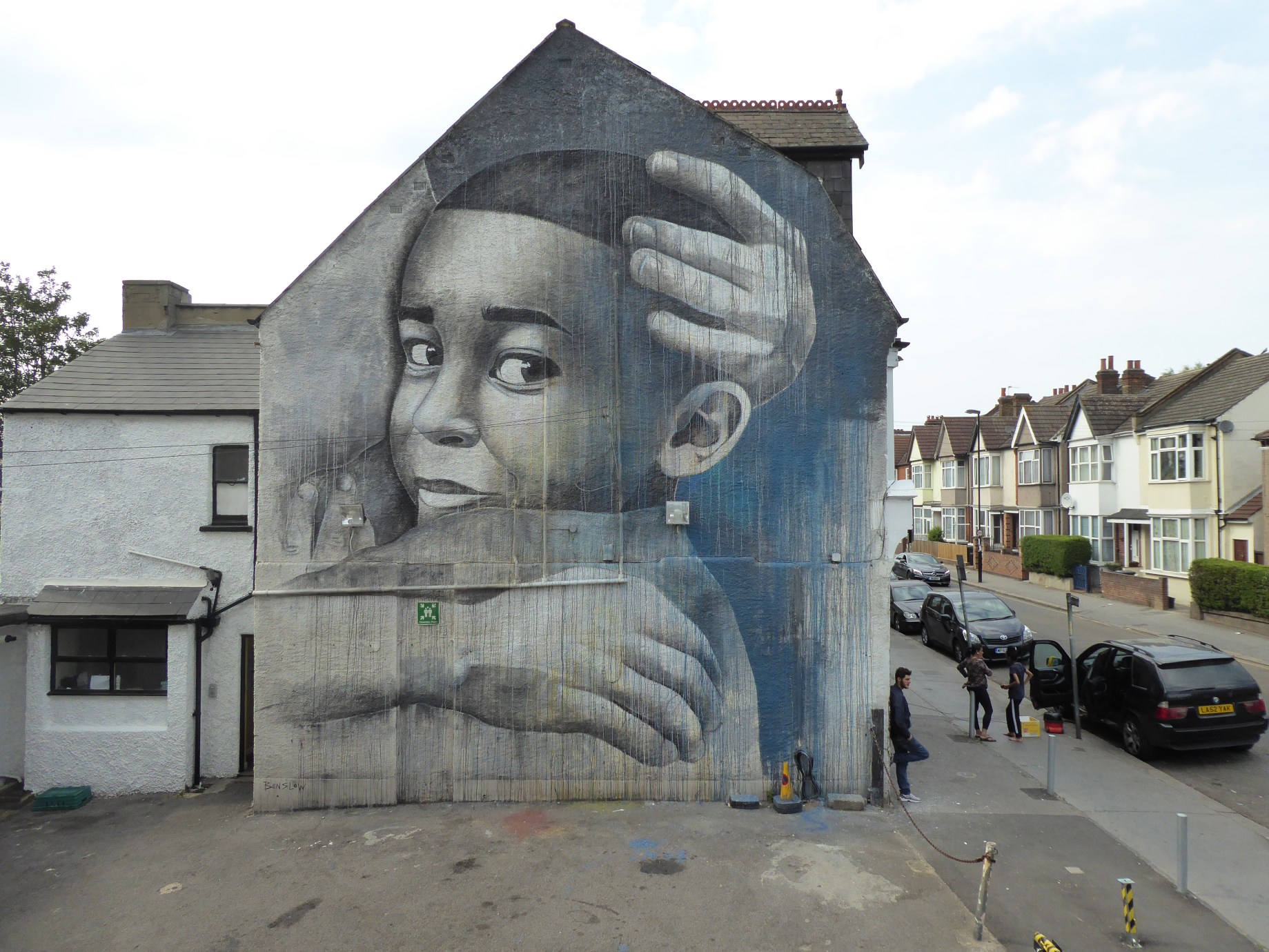 Here we are taking a look at one of 2 large-scale murals that have been recently placed up around Thornton Heath in South East London, and on this occasion by Street Artist Ben Slow. Crafted by brushes the work comprises a soulful subject constructed from a minimal colour palette which is prevalent in this artists output and which generates such a captivating scene, which this time really captures a sense of uncertainty and fear rooted in the internal desire to stay together, protected by those we know and love. This striking work can be found at the corner of Brigstock Road / Melford Road and placed up on the Refugee Centre in Thornton Heath.