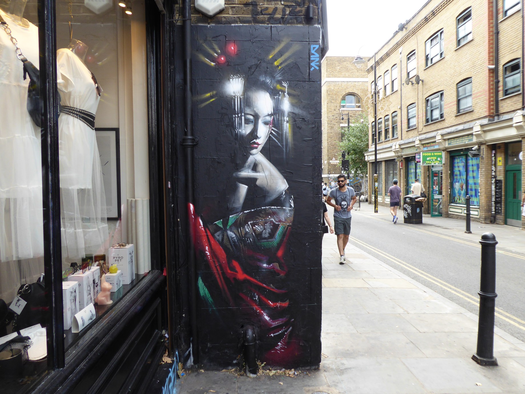 Beautiful work of a Geisha in a more minimalist setting, but no less striking for it, set along Brick Lane.