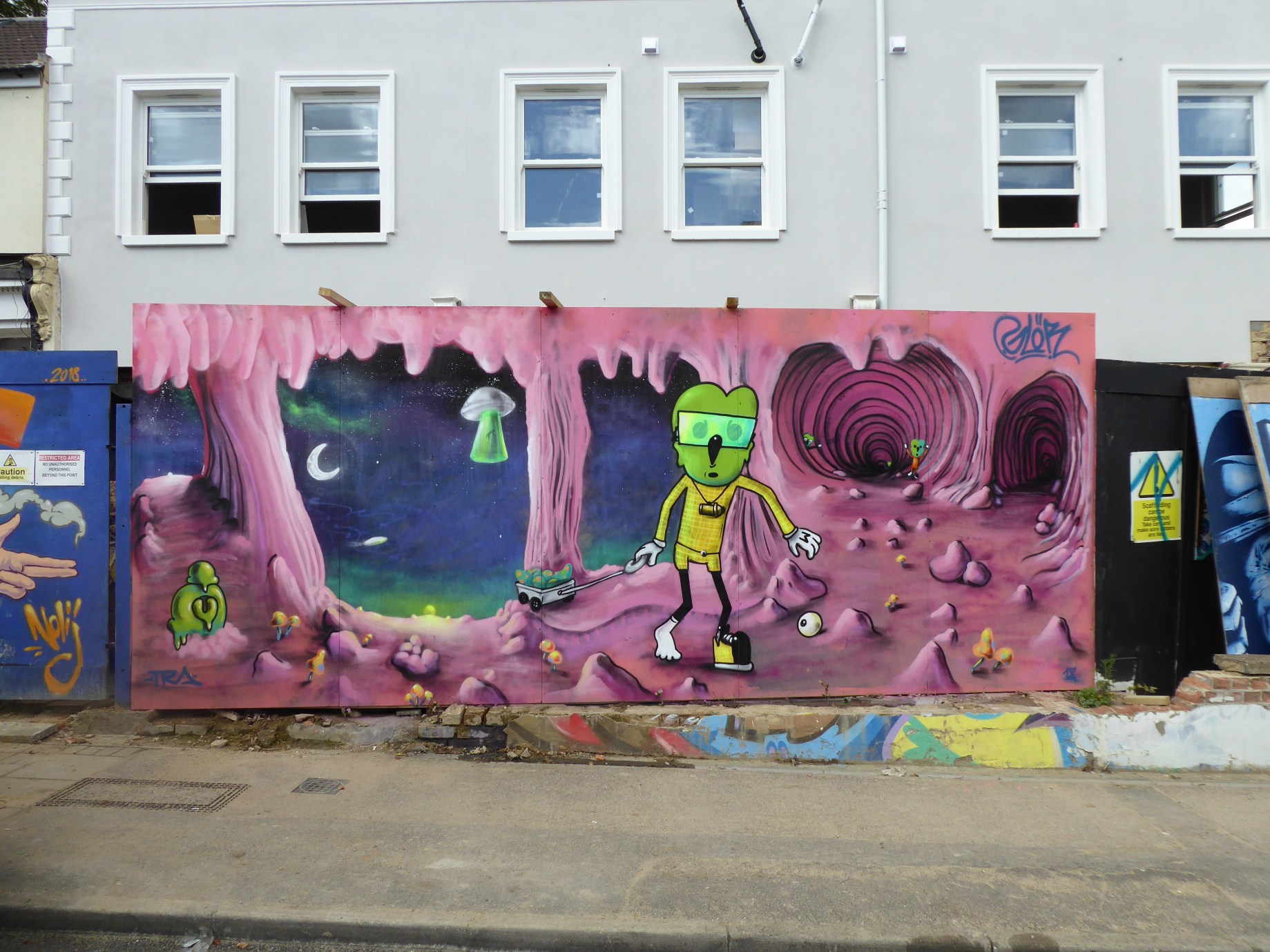 Last month saw Brazilian born but London based, Street Artist and Graffiti Writer Glor take a visit to Penge to add some of his distinct fun characters that have seemingly appeared all over London over the last year. Presenting his trademark character who is always shown with at least one shoe missing and an orthopaedic boot on the other, as well always shown with one eye out of its socket offering a reminder to always pay attention to what is around you and where you are going. This character is often set on his own as in his second work in Penge on a door and he also left us with the first full on scene he has painted since his return to London in the last year. We would like to say thanks to the kind developers of the former Golden Lion pub and the owners of Jacks Quick Stop for allowing us to get Glor to add something so creative to their property. We also would like to offer a big thanks to Glor for coming to add these works to our SprayExhibition20 community project.