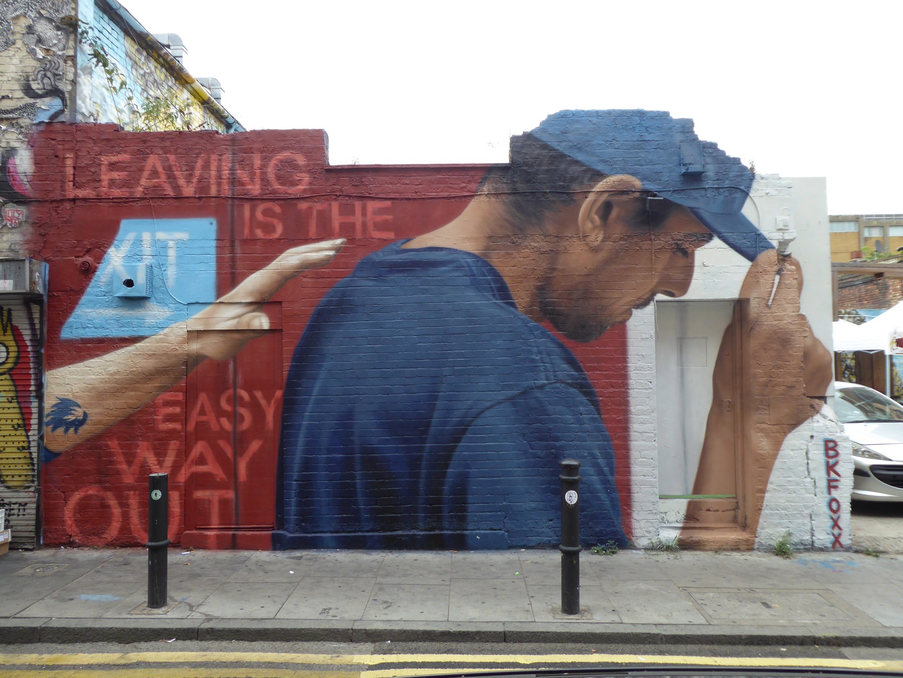 ‘Leaving Is The Easy Way Out’ in Hanbury Street, Brick Lane, with topical work as the UK currently flounders following the 2016 decision to leave the European Union. Nice to see an outside perspective on this farcical position. This work was placed up with support from Monoprixx & Not Banksy Forum.