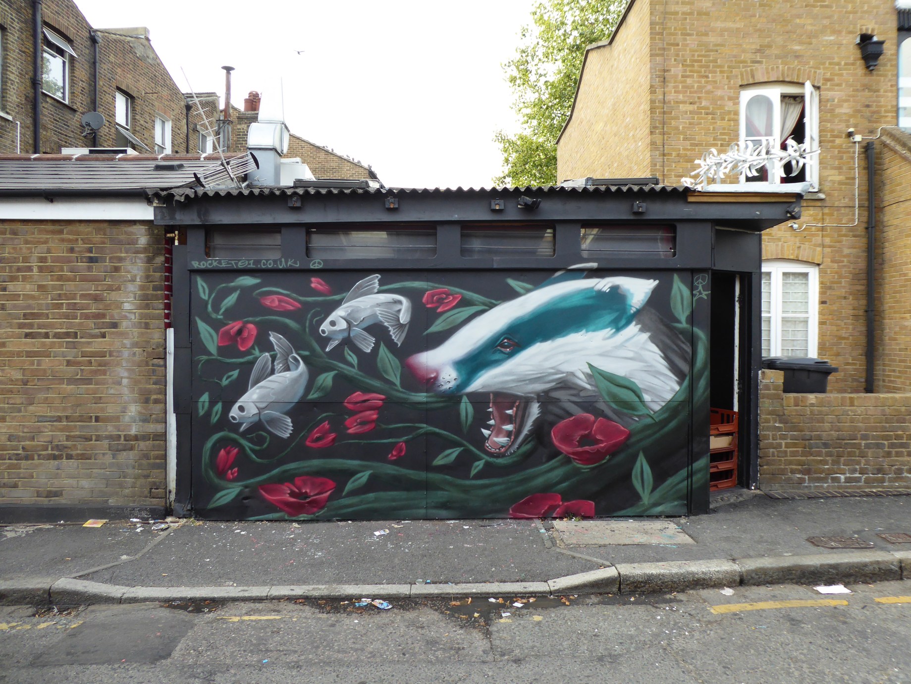 Here we are taking a look at a recent addition to Stockwell by UK born, but Bulgaria based, Street Artist Rocket01 and what a beautiful artwork it is. Through his work Rocket transports his audience to another world, a futuristic surreal and stark alternate reality imbued with a sense of loss and hope. Presenting a snapshot into his world as if encapsulated within a terrarium offering a glimpse of his dreamy and atmospheric visions. Rocket01’s scene’s are often set as if viewed through a light shone through really generating a sense of another place with different a different way of being. Through his art their is a consistent environmental message at the very core of his creations showing a vision of future defined by ecological ruin where mankind and nature need to unite for mutual survival against the devastation already prevailing. For his latest addition to London – and a quick effort also – Rocket01 has left a truly magical and surreal scene entitled ‘Overseas and Underground’ featuring a captivating fusion of a badger and a pair of fish enveloped in the plant-life that resides in this captivating realm. As always a BIG thanks to Rocketo1 for coming to support our project in Stockwell.