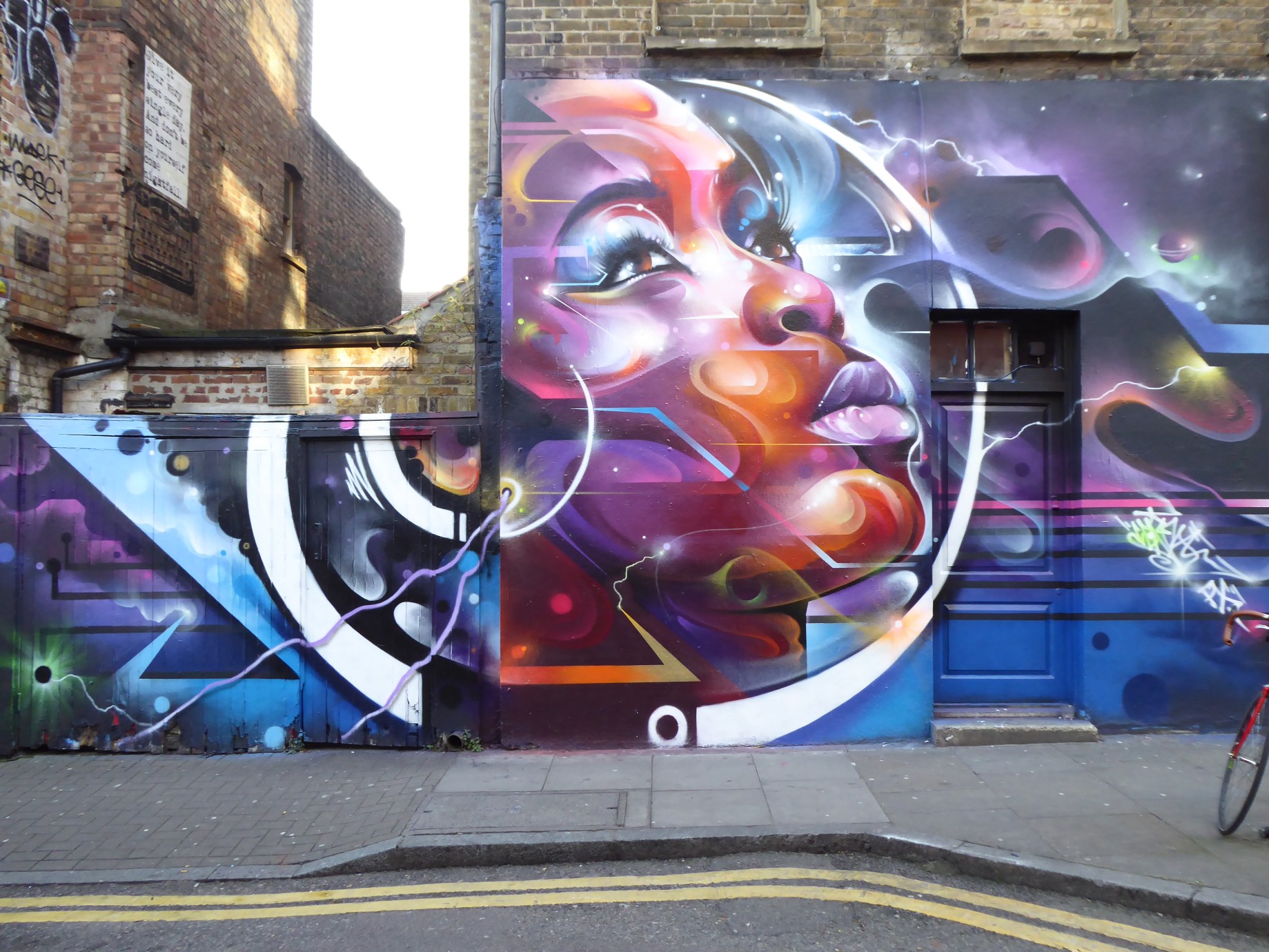 Here we taking a look at a recent addition to Brick Lane from Street Artist Mr Cenz placed up last month. It’s been a while since we have had the pleasure of seeing fresh work from Mr Cenz around London so it was quite the treat to spy his latest piece placed up in Hanbury Street depicting one of his striking female portraits created in his distinctive sci-fi and cosmic-fueled styling, seemingly imbued with that translucent quality that defines his work and injects his subjects so full of life.