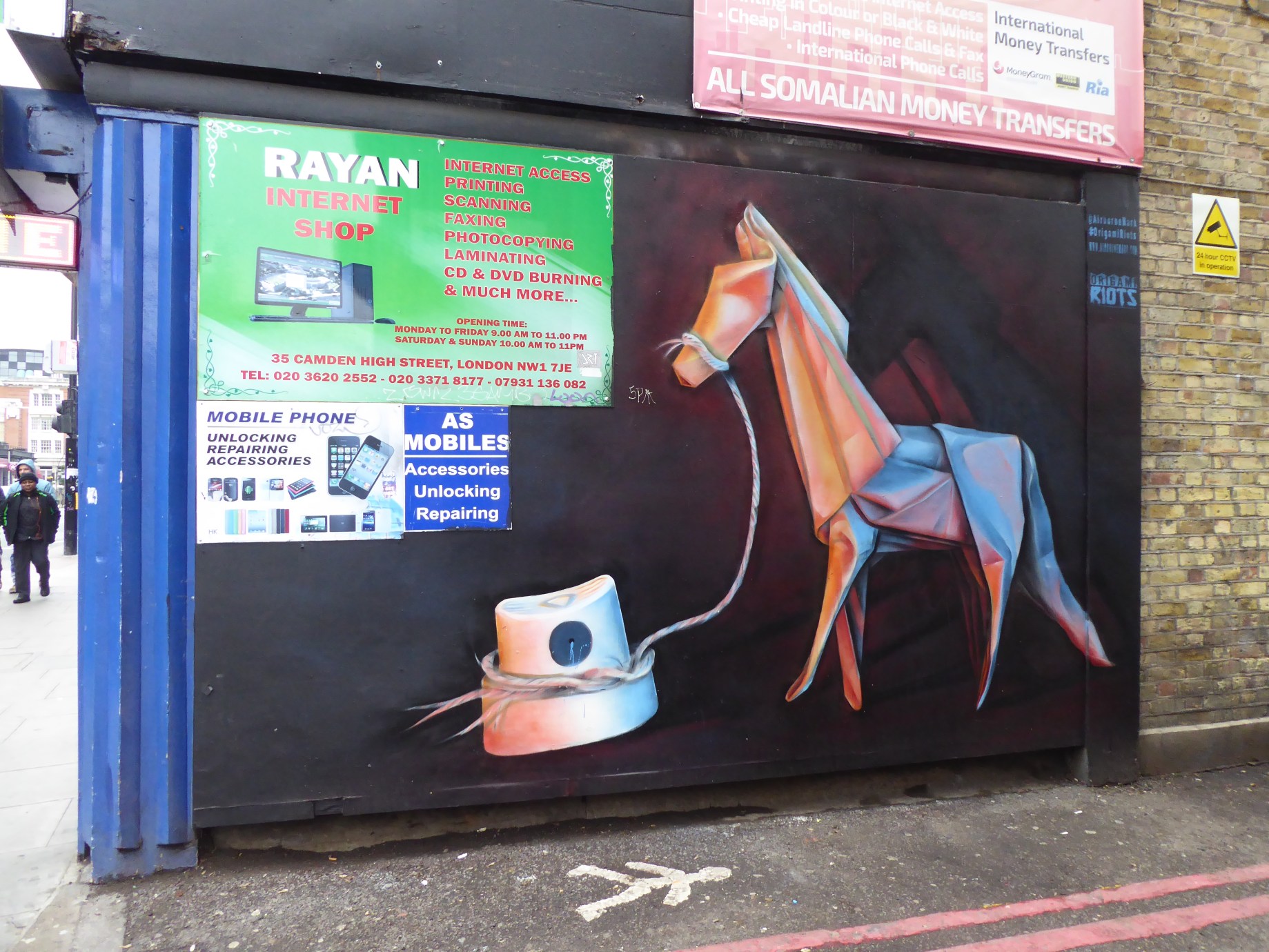 We haven’t had much reason for visiting Camden Town over the last year as the area has so little of the thriving Street Art Scene that was prevalent until the last couple of years, however our recent visit to this corner of North London was well worth it to see the latest addition to the town by Polish born, but London based, Street Artist Airborne Mark. Who took the space provided and the chance afforded to craft one his case studies in light and shadow through his favoured paper platforms based on origami designs he generally folds himself, but on this occasion features a Origami horse provided by Origami Artist Ross Symons who sent the design from South Africa for Airborne Mark to bring it to life in an urban setting. Taking Ross Symon’s design Airborne Mark then added his own touch of ‘Origami Riots’ to things with some string and plastic in the form of a cap being added to the paper subject which was all then subjected to some additional red and blue lighting in order to create his Origami Horse suitably placed up in close proximity to the Camden Stables a reference to the market just up the road that was in the past a horse stables and hospital and Airborne Mark being “a work horse of street art folds”. This fantastic work can be found in Symes Mews, just off of Camden High Street, Camden Town and was put up with support from The Real Art Of Street Art.