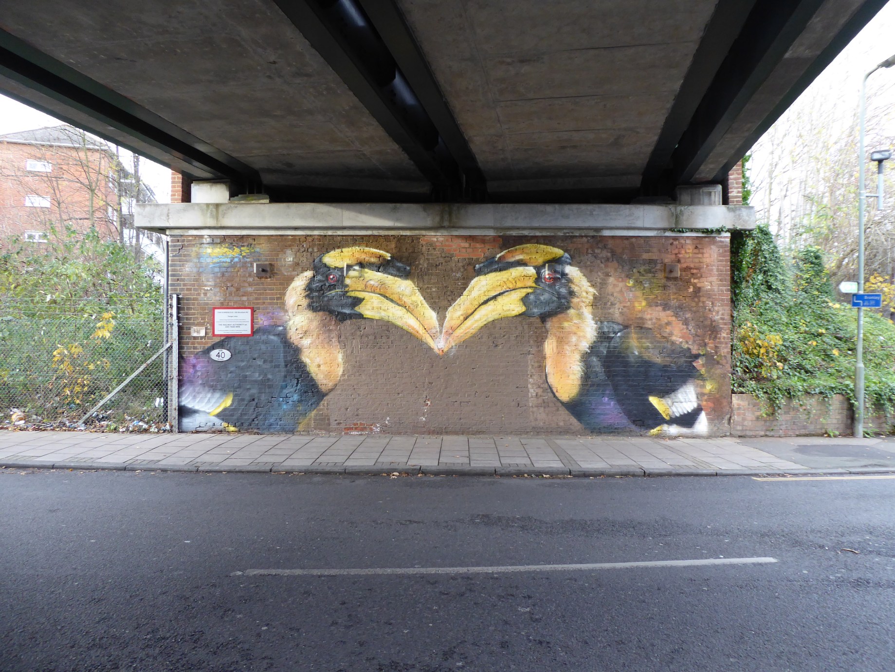 Here we are taking a look at a recent addition to Penge from Street Artist Aspire who tackled our a second spot in conjunction with Network Rail for SprayExhibition20 and did so in first class style. Truly a captivating scene set in that delicate soft effect that defines Aspire’s own style of ethereal realism which exudes so much life and warmth through his exquisite creations. On this occasion Aspire has for the first time around Penge opted for something a tad more exotic in his subject than we normally see, with his pair of symmetric set Great Hornbills aptly entitled ‘Double Trouble’, making fantastic use of the dirty brick work and really bringing some colour and life to this corner of SE20.