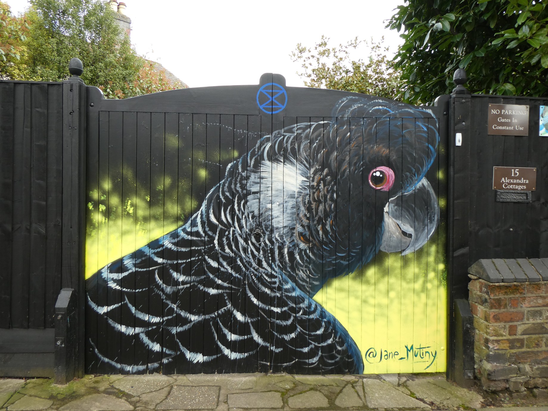 Here we are taking a look at a recent addition to SE20’s thriving art scene, with this striking work by Jane Mutiny, placed up a few weeks back for our community project in our hometown. Taking to a spot Jane first painted in January 2018 for the blog’s third anniversary Paint Jam – where Jane left the town with a lovely pair of Tahake from New Zealand – on this occassion Jane left SE20 with a striking depiction of a Carnaby’s Black Cockatoo, keeping to her themed subjects of endangered and extinct species from around the globe. Not only does her artwork feature subjects which are environmentally focused, the tools with which Jane Mutiny constructs her artworks are all created using ecologically sound paints and brushes to generate that rich textured effect prevalent in her output. Big thanks to Kevin for the spot, the help prepping it, on the day and whenever the project has needed a hand for that matter! Big thank you to Jane Mutiny for returning to Penge and treating us to such a lovely upgrade. This beautiful work can be found in Parish Lane, Penge and was placed up with a little support from us London Calling Blog for SprayExhibition20.