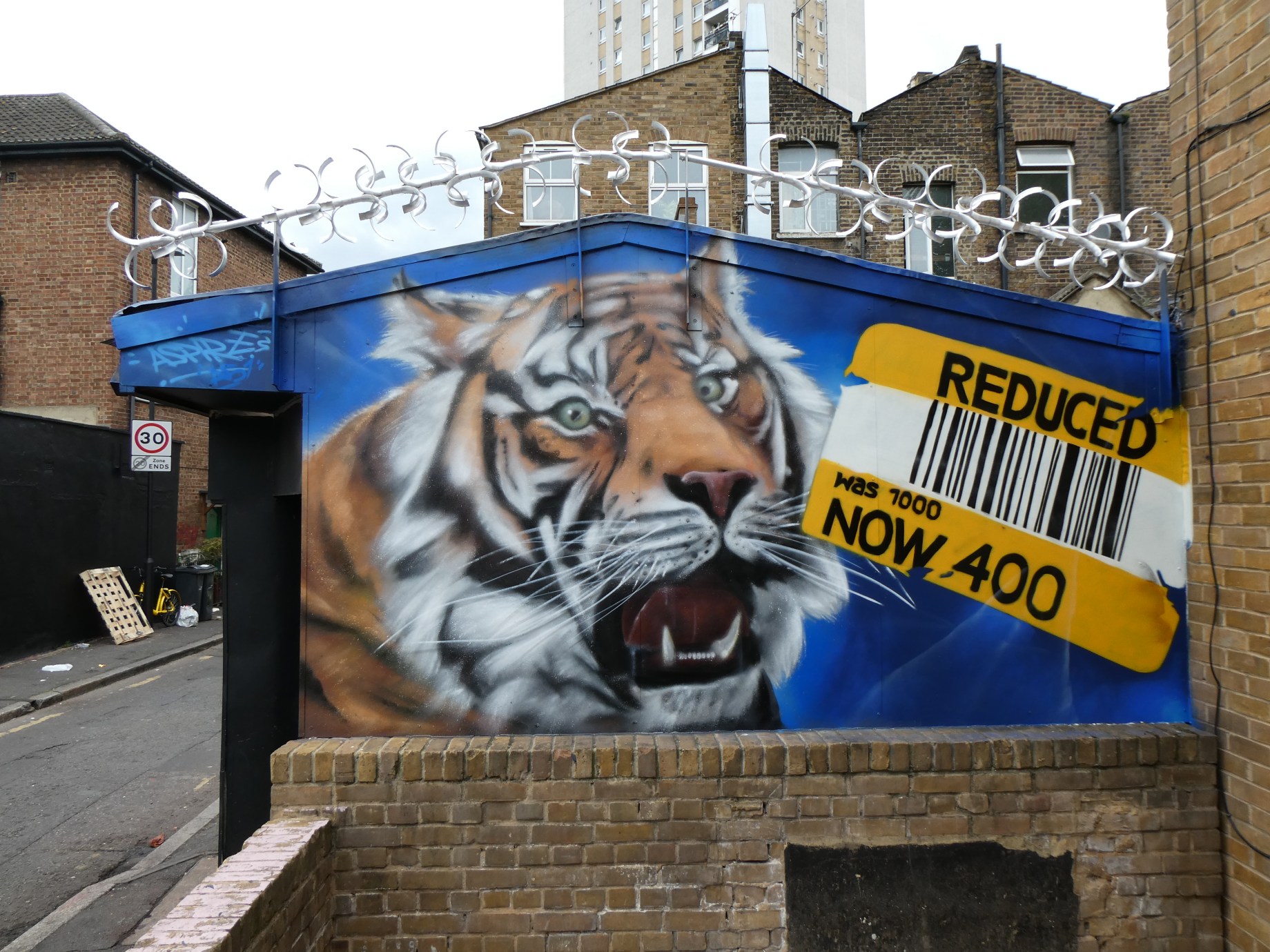 Here we are taking a look at a recent addition to Stockwell from Street Artist Aspire placed up a couple of weeks ago. Aspire’s work which predominantly features animal subjects on this occasion features a Sumatran Tiger with a yellow reduced price sticker slapped on the foreground of its world, a nod to how the Sumatran Tiger population has decreased from 1000 in 1978 to 400 in 2019 due to a combination of poaching and deforestation for products such as Palm Oil. We love the juxtaposition of the delicate soft effect that defines Aspire’s own style of ethereal realism which exudes so much life and warmth through his exquisitely depicted subjects alongside the stark nature of the design and subject matter in this particular work from Aspire. This work can be found in Stockwell, and was put up with support from us London Calling Blog.
