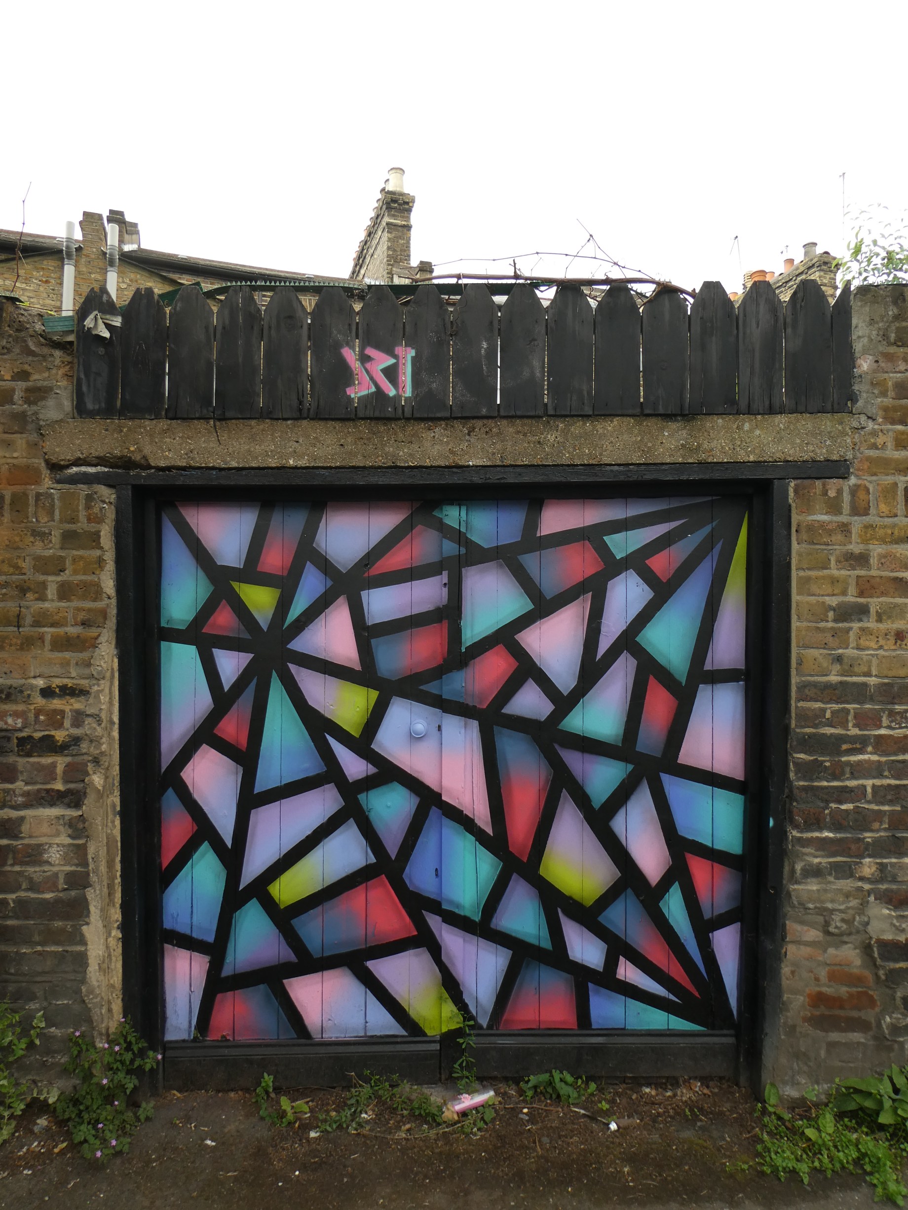 Here we are taking a look at a recent addition to Stockwell from Abstract Street Artist DRT which features the artists trademark abstract pattern work which very much resembles a stained glass effect. It’s been a pleasure seeing DRT’s work develop over the last few years as well as how well suited it is to any canvas big or small as this well suited design demonstrates on this set of doors. This striking work can be found in Stockwell and was put up with support from ourselves London Calling Blog.